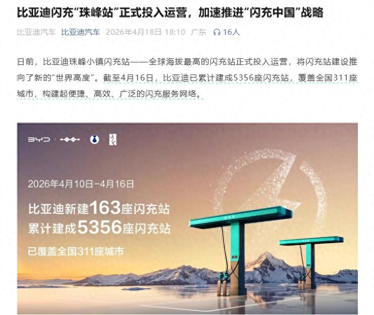 每经AI快讯,4月18日,据比亚迪消息,比亚迪珠峰小镇闪充站——全球海拔最高的闪充站日前正式投入运营。截至4月16日,比亚迪已累计建成5356座闪充站,覆盖全国311座城市。此前,比亚迪已宣布将于2026年年底在全国建设20000座闪充站。