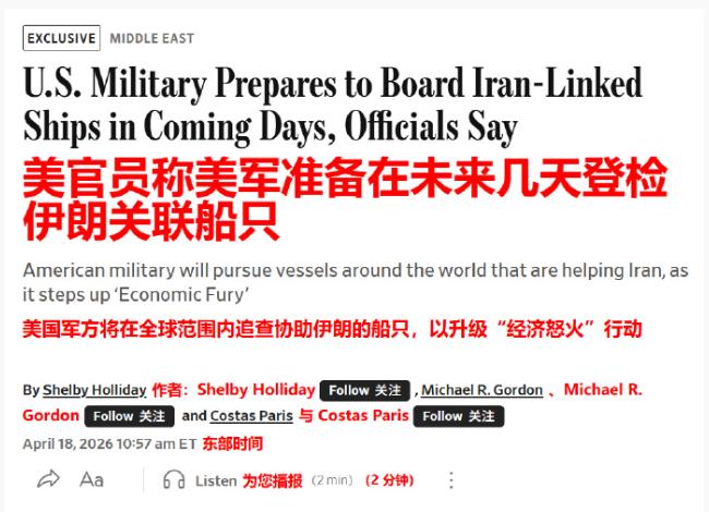 美军准备对中方商船下手?五角大楼透露,将登检与伊朗相关的油轮! 《华尔街日报》4月18日援引美军中央司令部官员的话说,美军要在未来几天内登检并扣押在国际水域航行的、跟伊朗有关联的油轮和商船,把海上打击行动推到中东以外。 美军参谋长联席会议主席凯恩也说得很直白:这一次,美军不但要全球追查挂伊朗旗的船,还要拦截给伊朗运东西的船,印度洋和太平洋部队都会参与。 美国财长贝森特在IMF会议场边也公开放话:“那些船不再被允许通过,所以他们今后拿不到石油了。” 过去半个月,美军的动作已经有迹可循。至少有14艘船被美军逼得掉头。其中至少6艘和中方有关。美军还拦了一艘叫“Murlikishan”的油轮,另一艘“Rich Starry”中资油轮在阿曼湾被美军驱逐舰拦下,然后4月15日凌晨被迫180度调头,重新返回波斯湾。 短期看,美军的登舰行动会在未来几天启动。可能先从已经离港的伊朗关联船只下手,杀鸡儆猴。中资船队会被重点盯防。而且这一次美军大概率是要登船抓人的。 笔者觉得,美国在玩一场高风险游戏。一方面,这些登检行动的法律依据很模糊。国际水域登检他国商船,国际法上争议很大。另一方面,美军手伸到印度洋甚至太平洋,中方海军会不会有动作?会不会派护航编队?这些都是未知数。