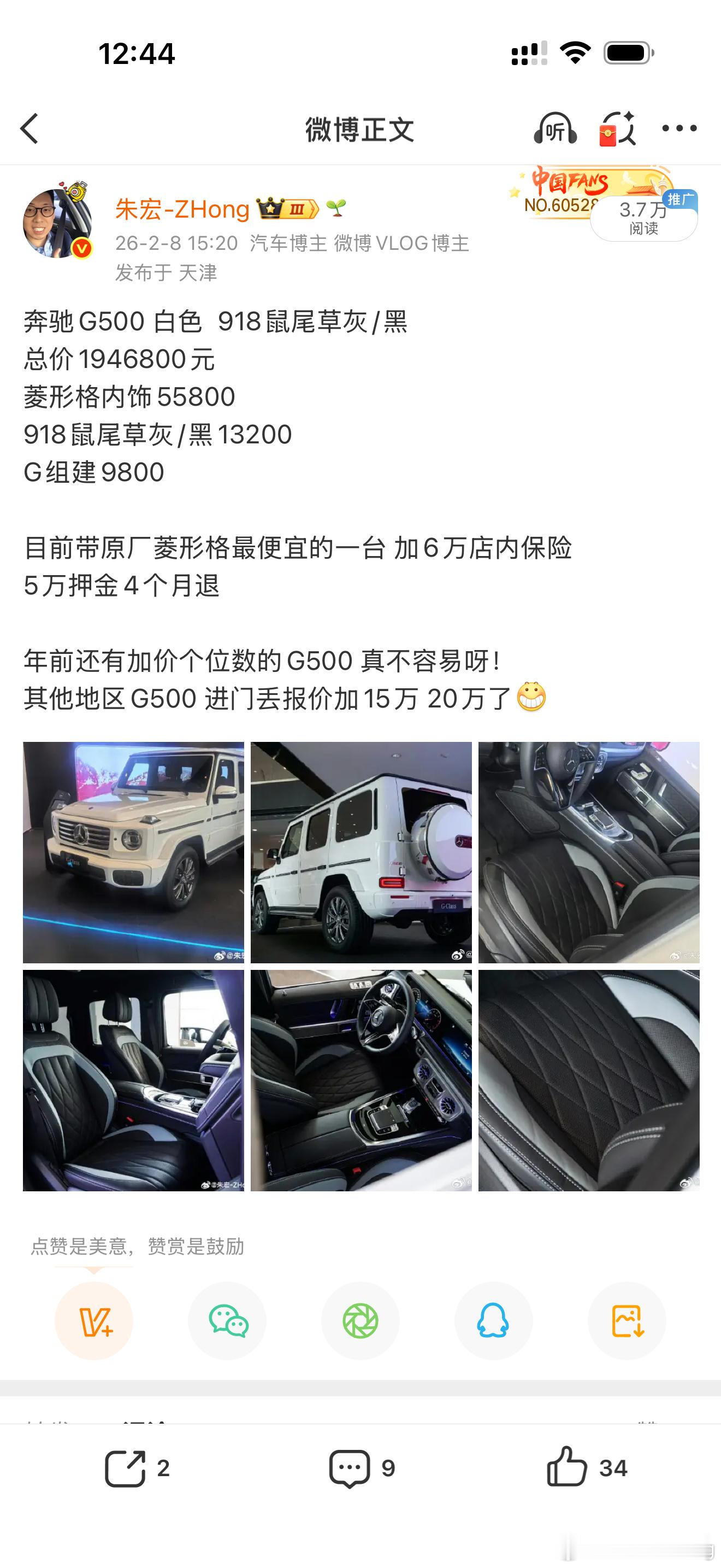 奔驰G500 白 鼠尾草+标志组件9800+尊贵内饰组件55800+鼠尾草灰色 A带13200配置价1946800这台车加价43000元豪车税…这价格还可以啊…