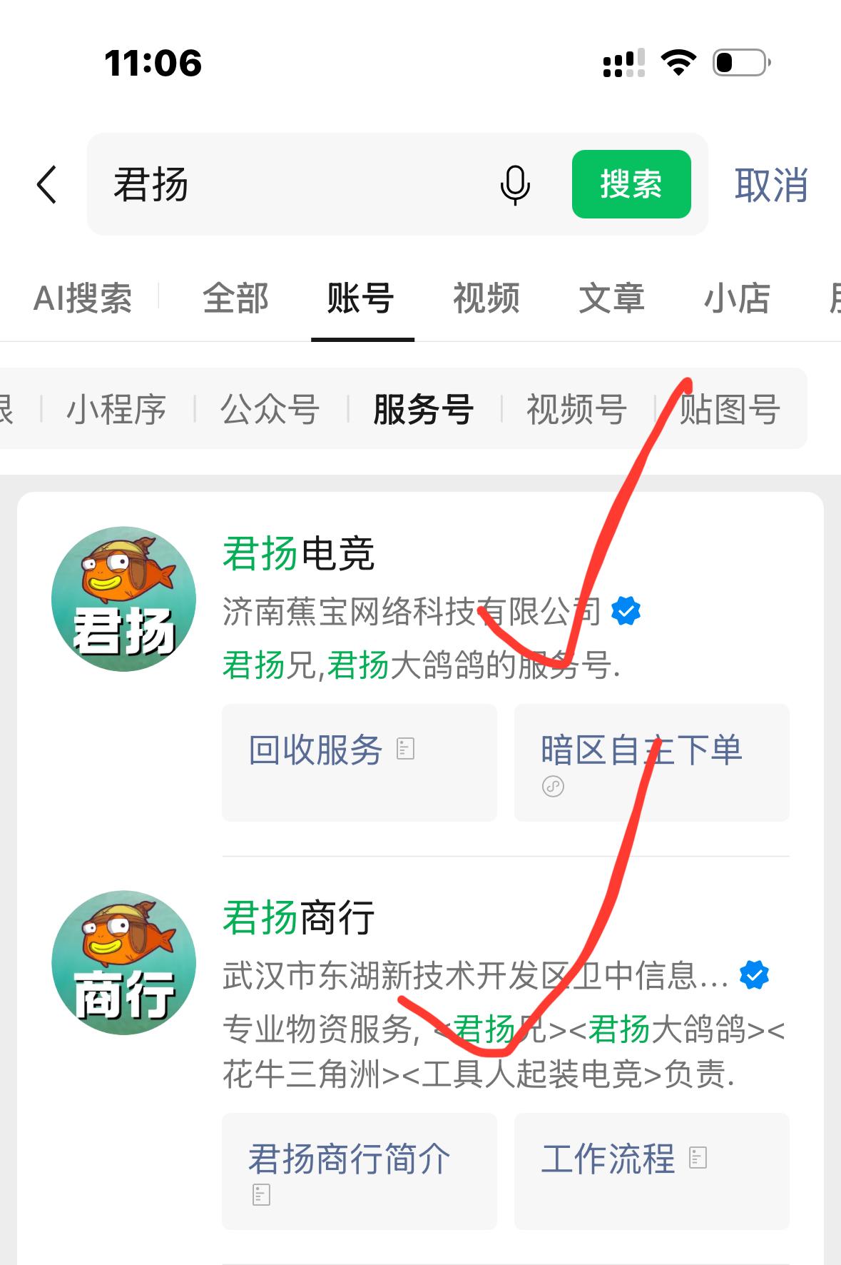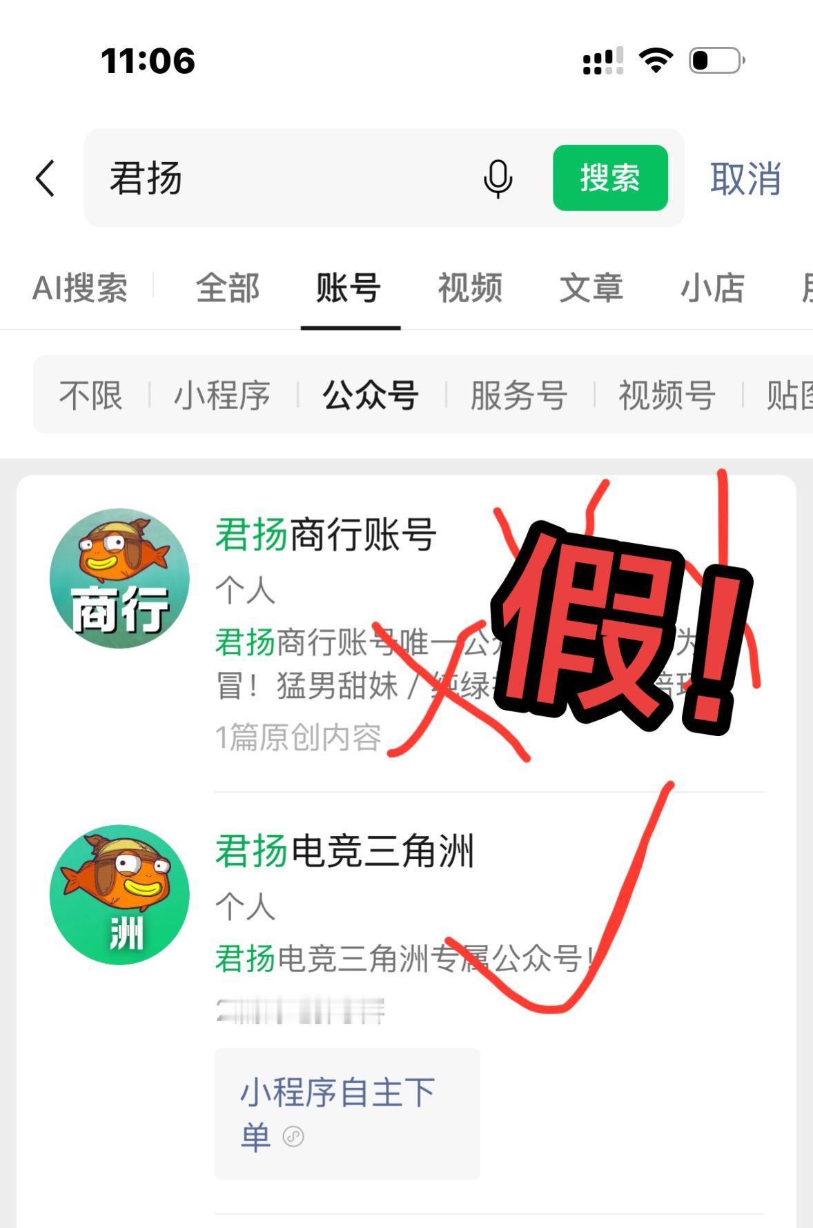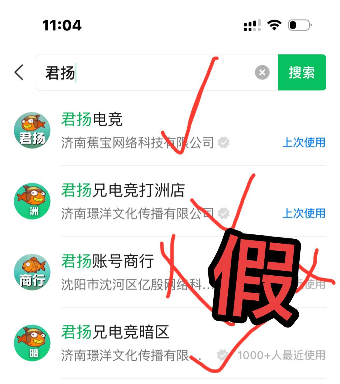 注意防骗!出现假冒!近期出现假冒君扬电竞的小程序和服务号,大家一定要认准济南公司认证的!君扬电竞不会用qq接待,企业微信也一定带有”君扬兄”三个字才是真的!君扬电竞 君扬商行 @君扬电竞(暗区三角洲)