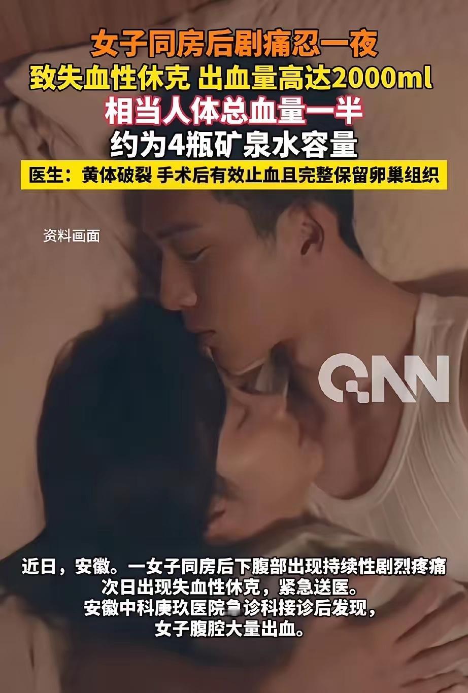 安徽,女子和男友许久未见,见面自然而然发生了亲密关系。谁知,一番恩爱结束后,女子突然腹痛难忍,本以为是动作太大,休息一下就过去了,万万没想到,第二天还疼得她浑身冒冷汗。这下男友急了,赶紧把人送到医院,医生检查发现,女子已经失血性休克,腹部出血量高达2000毫升,有四瓶矿泉水那么多。幸亏医生救治及时,才把人从鬼门关拉回来。网友∶不娶她就对不起她! 这哪是谈恋爱,这分明是在玩命! 2000毫升,什么概念?对于一个体重100斤的年轻姑娘来说,这几乎是她全身血量的一半! 四瓶矿泉水倒进肚子里,那是会出人命的。 医生打开腹腔的时候,满视野都是暗红色的血。右侧卵巢上,一个鸡蛋大小的黄体囊肿,像个熟透了的番茄,被外力一挤,“啪”地一声,裂开了。 血液就这么悄无声息地涌进腹腔,把一个大活人往休克里推。 而这一切的起因,仅仅是因为一次久别重逢的激情。 姑娘一开始也以为是自己太娇气,动作大了点,忍忍就过去了。 可她不知道,有一种痛,是绝对不能忍的。 这种病,叫“黄体破裂”。 听名字挺陌生,但它其实是育龄期女性最凶险的妇科急腹症之一,堪称“妇科的宫外孕”。 每个月排卵后,卵巢上都会形成一个叫“黄体”的临时结构。它像个壁薄、血管丰富的“小血囊”,负责分泌孕激素,为可能的怀孕做准备。 在下次月经来潮前的一周左右,这个“小血囊”会发育到最大,也最脆弱,就像一个吹到极限的气球,皮薄馅大,一戳就破。 这时候,任何让腹腔压力突然增高的行为,都可能成为压垮它的最后一根稻草。 激烈的性生活、剧烈的跑跳、甚至是用力咳嗽、便秘时用力排便,都可能让它“原地爆炸”。 而一旦破裂,后果不堪设想。 少量的出血,身体或许还能自行吸收,可能只是轻微腹痛。 但一旦破口较大,血液就会像开了闸的洪水,迅速涌入腹腔。 最要命的是,这种出血是内出血,外表根本看不出来。没有阴道流血,没有外伤,只有越来越剧烈的腹痛和越来越虚弱的身体。 很多人会像这位姑娘一样,误以为是肠胃炎,或者单纯的“动作太大”,选择硬扛。 这一扛,就可能把命扛没了。 从剧痛到休克,有时候只需要几个小时。 头晕、心慌、面色惨白、出冷汗、肛门坠胀感……这些都是失血过多的信号。 等到意识模糊、血压骤降,那就真的是在鬼门关前徘徊了。 这位姑娘是幸运的。 男友及时把她送到了医院,医生通过紧急手术,止住了血,保住了卵巢,也保住了命。 但幸运,从来都不是可以依赖的东西。 每年,都有无数类似的案例发生。 有女子因为便秘太用力,导致黄体破裂,腹腔出血1500毫升。 有女子在健身房做深蹲,突然腹痛倒地,送医后发现腹腔积血1000毫升。 更有甚者,因为延误治疗,最终不得不切除卵巢,永久地影响了生育能力。 这不是危言耸听,这是每天都在发生的真实悲剧。 而最大的敌人,不是疾病本身,而是认知的缺失和“忍一忍”的侥幸心理。 很多女性觉得,肚子疼不是什么大事,或者因为羞于启齿,不愿意去医院。 殊不知,在黄体破裂面前,时间就是生命。 每拖延一分钟,出血量就多一分,抢救的难度就高一截。 法律可以规定彩礼退多少,但生理规律不会跟你讲价。 身体的损伤,有时候是不可逆的。 所以,所有的女性,都请把这条信息刻在脑子里。 在月经来潮前的一周,也就是黄体期,请一定一定,要温柔地对待自己。 避免剧烈运动,避免腹部受到撞击,性生活时也要适度,切忌粗暴。 一旦出现突发的、单侧的、撕裂样的下腹剧痛,尤其是伴有肛门坠胀感,千万别犹豫,立刻、马上,去最近的医院挂妇科急诊! 不要自己吃止痛药,不要热敷,不要想着睡一觉就好。 直接告诉医生你的症状和月经周期,这是救命的信息。 至于那位男友,网友说“不娶她就对不起她”,这话听着解气,但重点错了。 娶不娶,是感情问题。 但懂不懂,是生死问题。 他做得最对的一件事,不是送她去医院,而是没有阻止她去。 他应该做的,是从现在开始,了解这些知识,在未来的日子里,和她一起规避风险,而不是事后用一纸婚约来弥补可能造成的伤害。 各位读者你们怎么看?欢迎在评论区讨论。