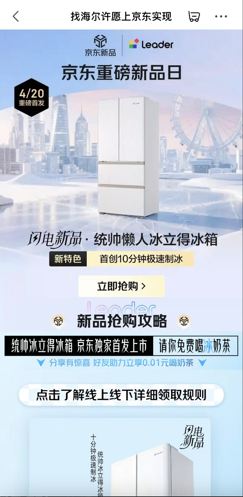 10倍速制冰冰箱只在京东从技术角度看,夏日制冰的痛点在于冷热交换的效率。统帅冰立得冰箱,核心卖点就是 10 分钟极速制冰,效率确实硬核 。4 月 20 日京东独家首发,还能享受国补 85 折,追求性能体验的极客朋友们可以关注下。而且京东联合统帅冰立得冰箱与新中式茶饮爷爷不泡茶还做了联名, 1:1 还原迷你冰箱造型的手提奶茶包装,把工业设计元素玩出了时尚感 。现在上京东搜「海尔许愿」还能免费领领冰箱款非遗冰酿奶茶 。戳 网页链接