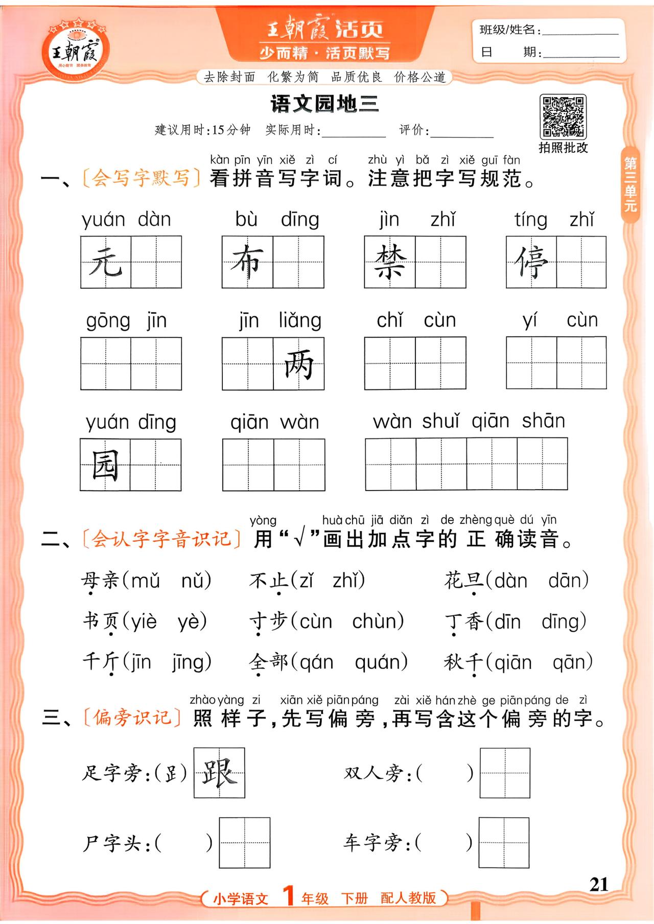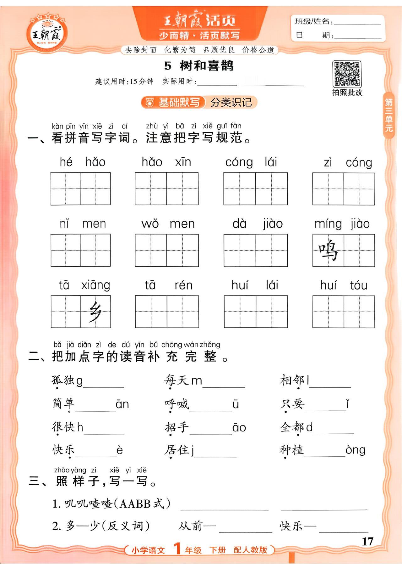 26春一年级下册语文,第三单元基础知识活页默写+参考答案,收藏备用