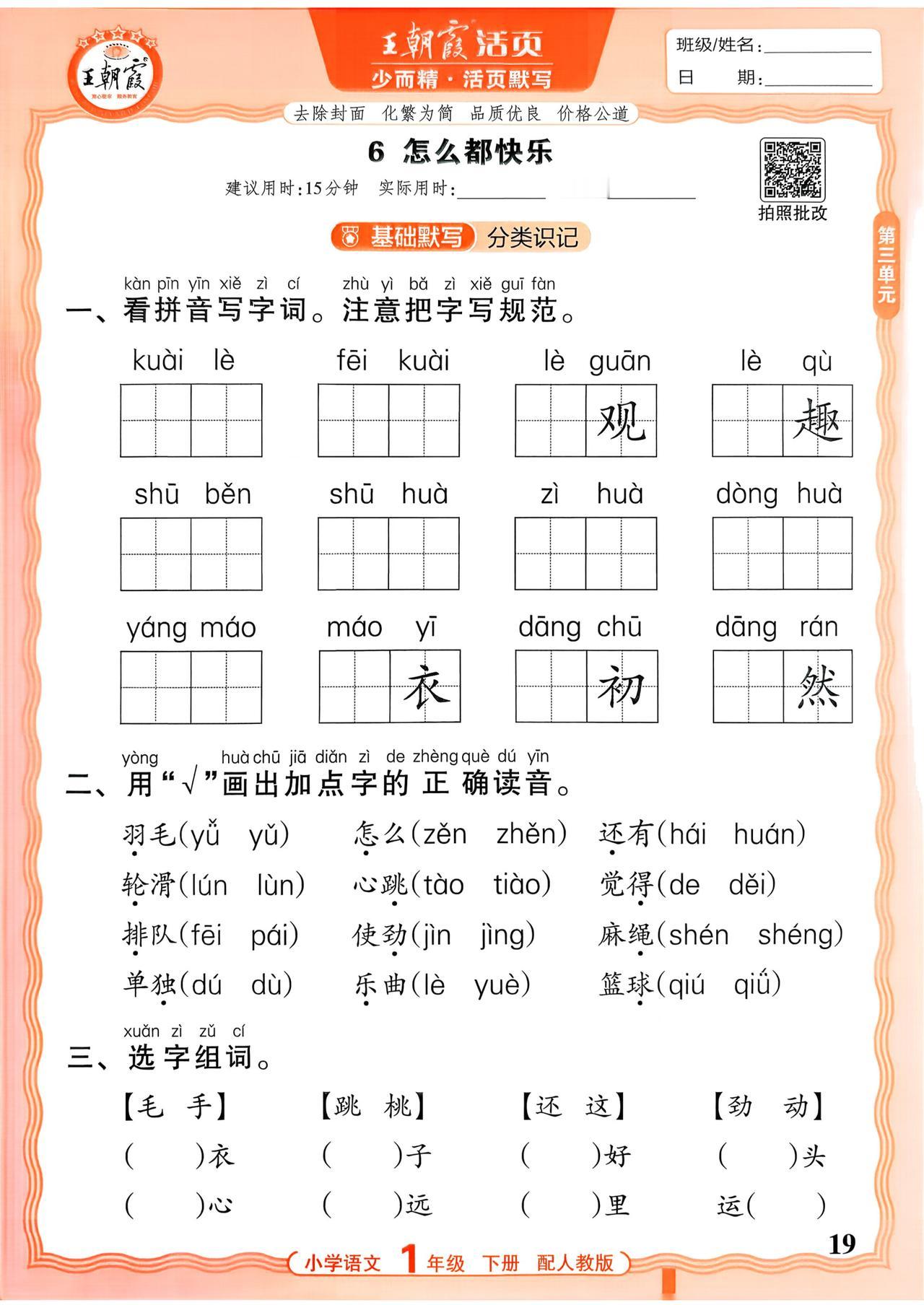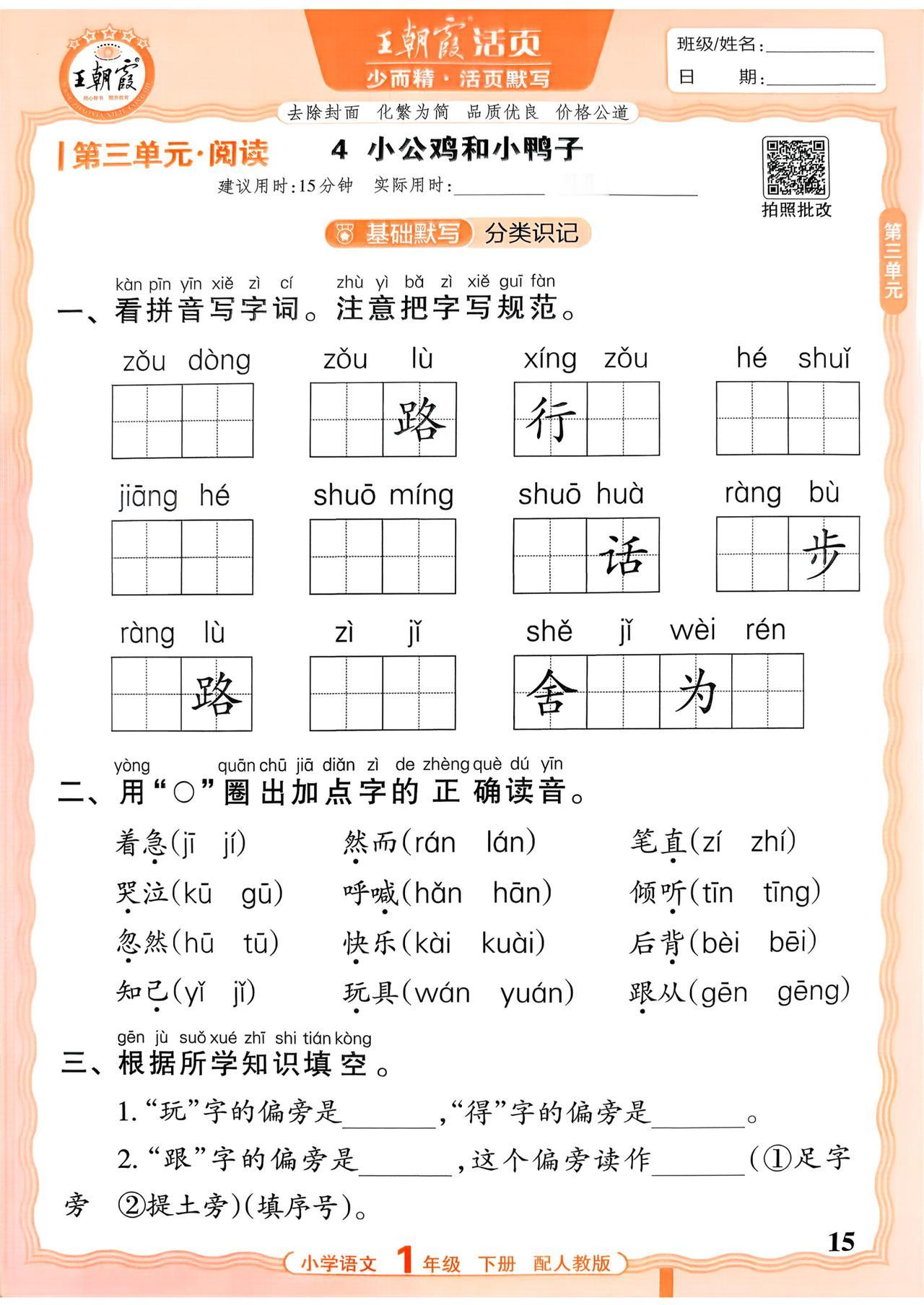 26春一年级下册语文,第一单元基础知识活页默写+参考答案,收藏备用