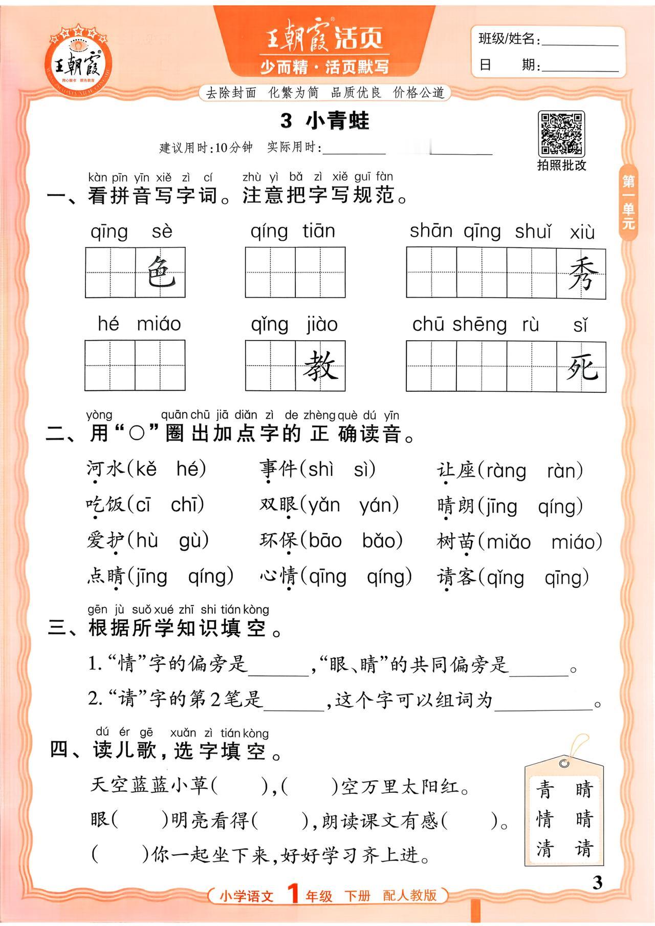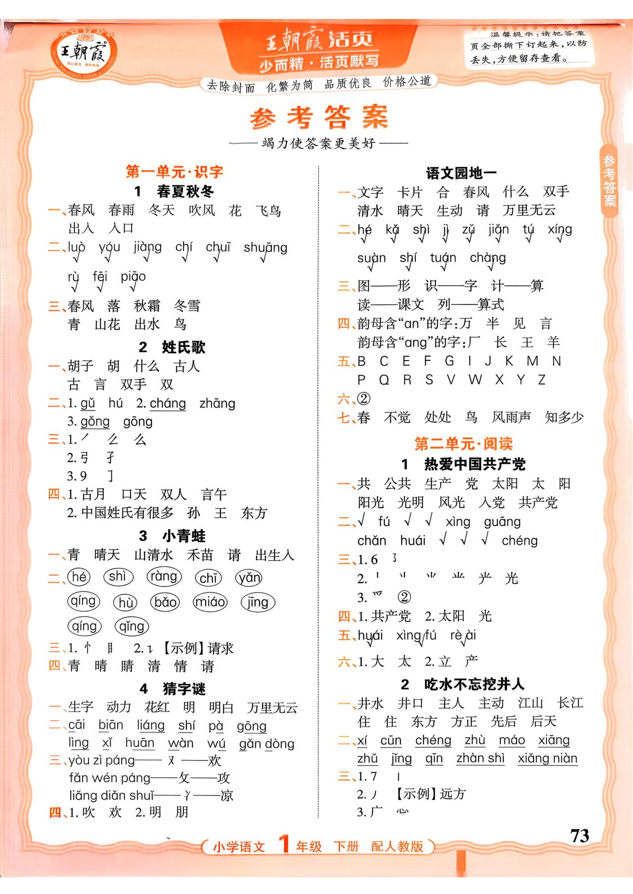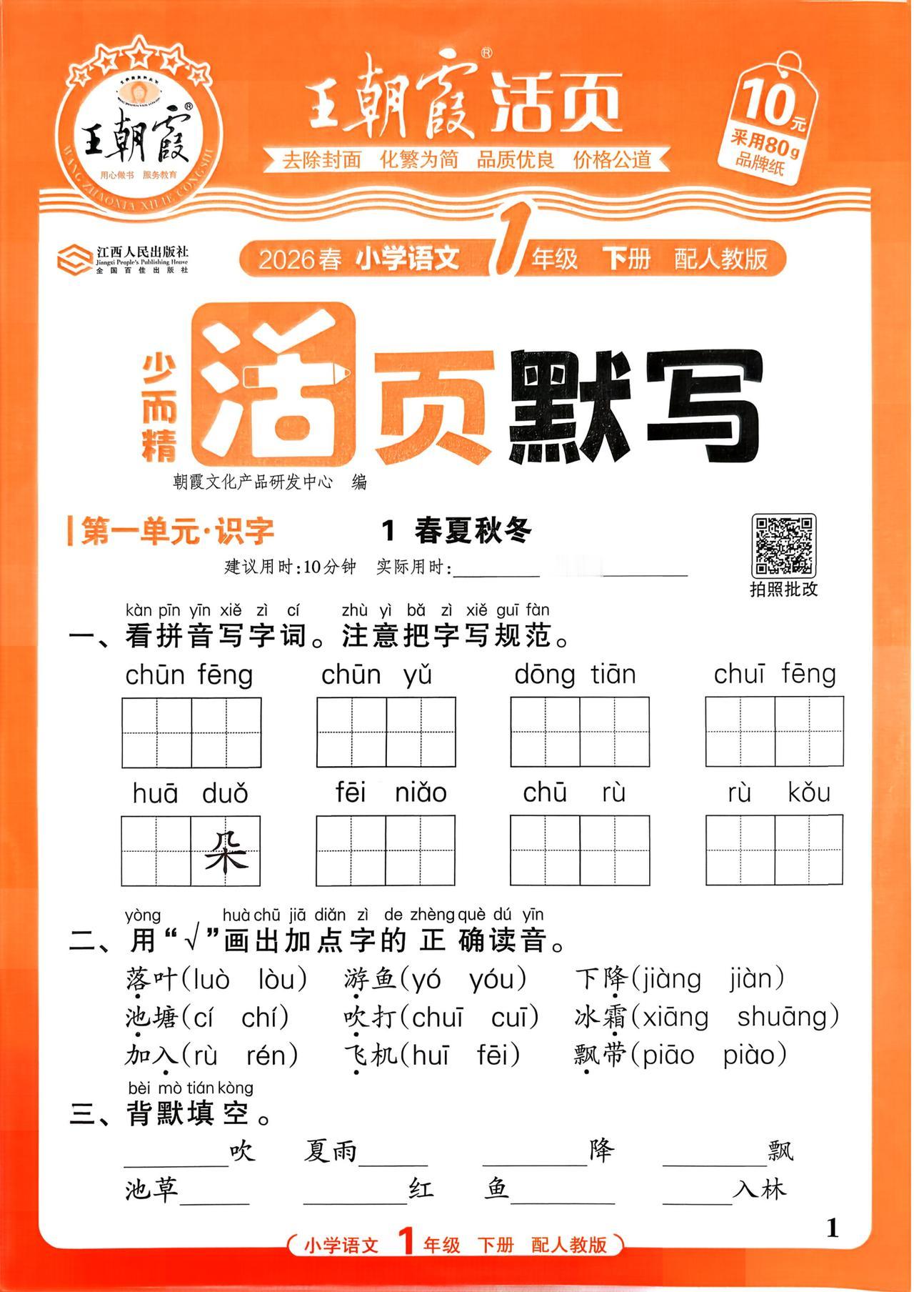 26春一年级下册语文,第一单元基础知识活页默写+参考答案,收藏备用