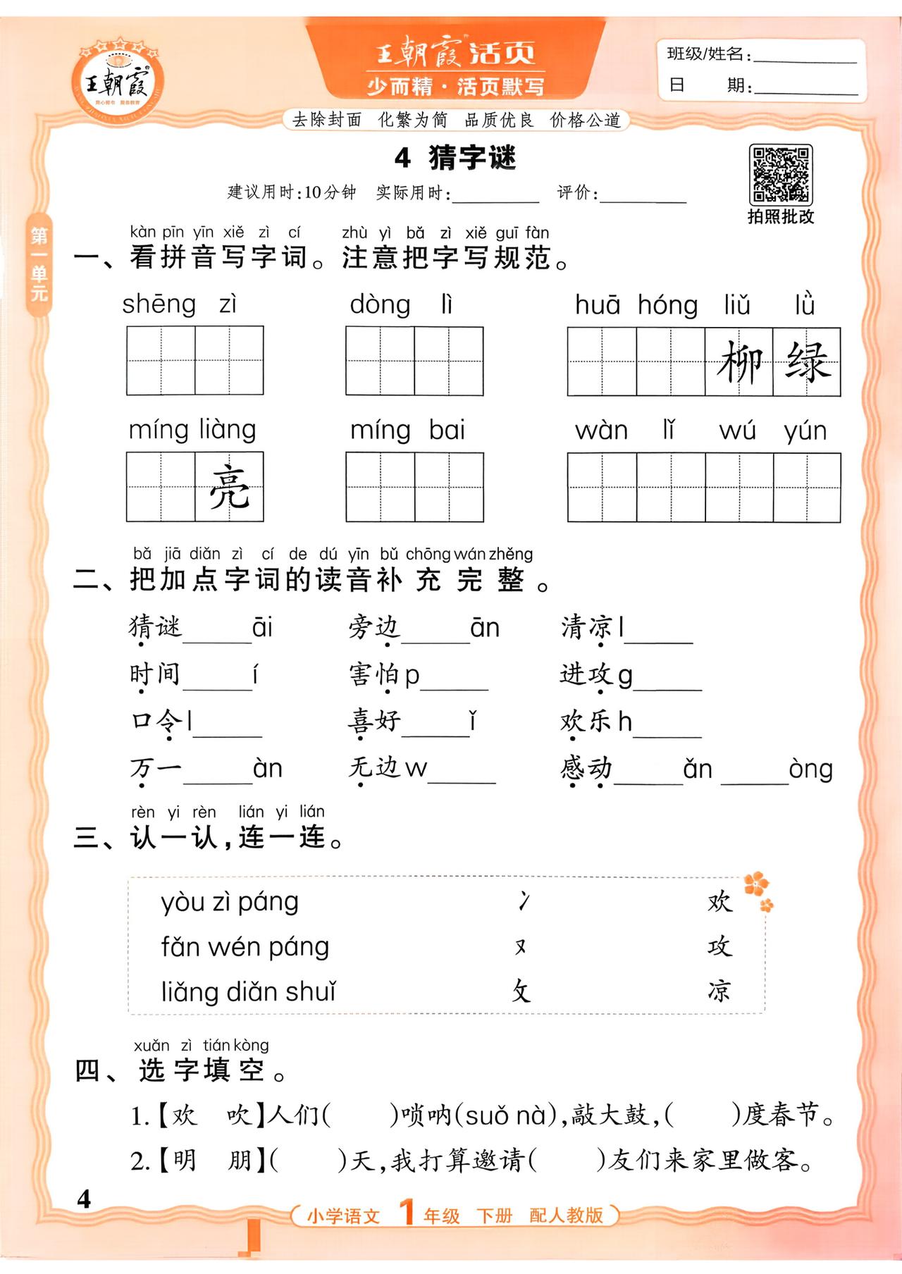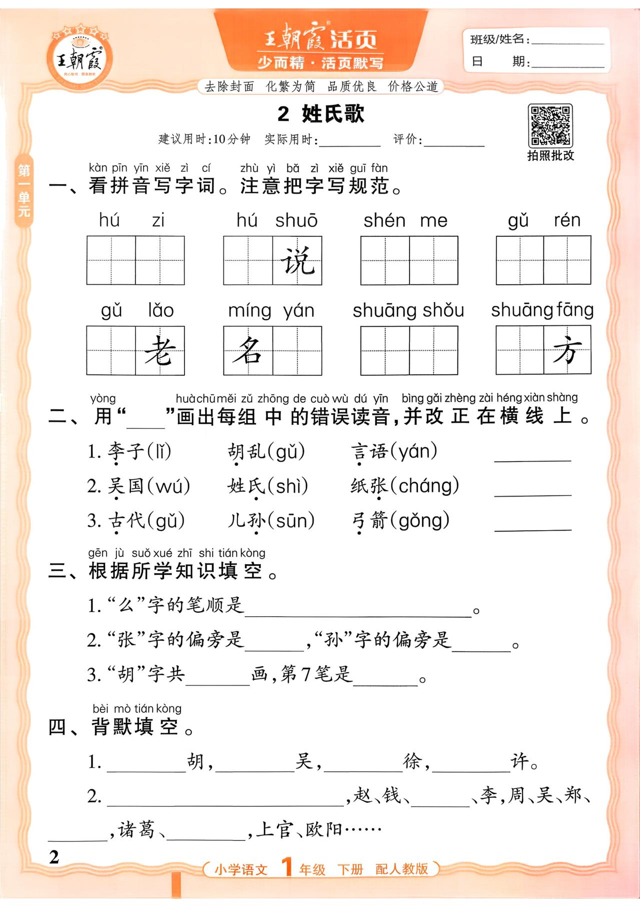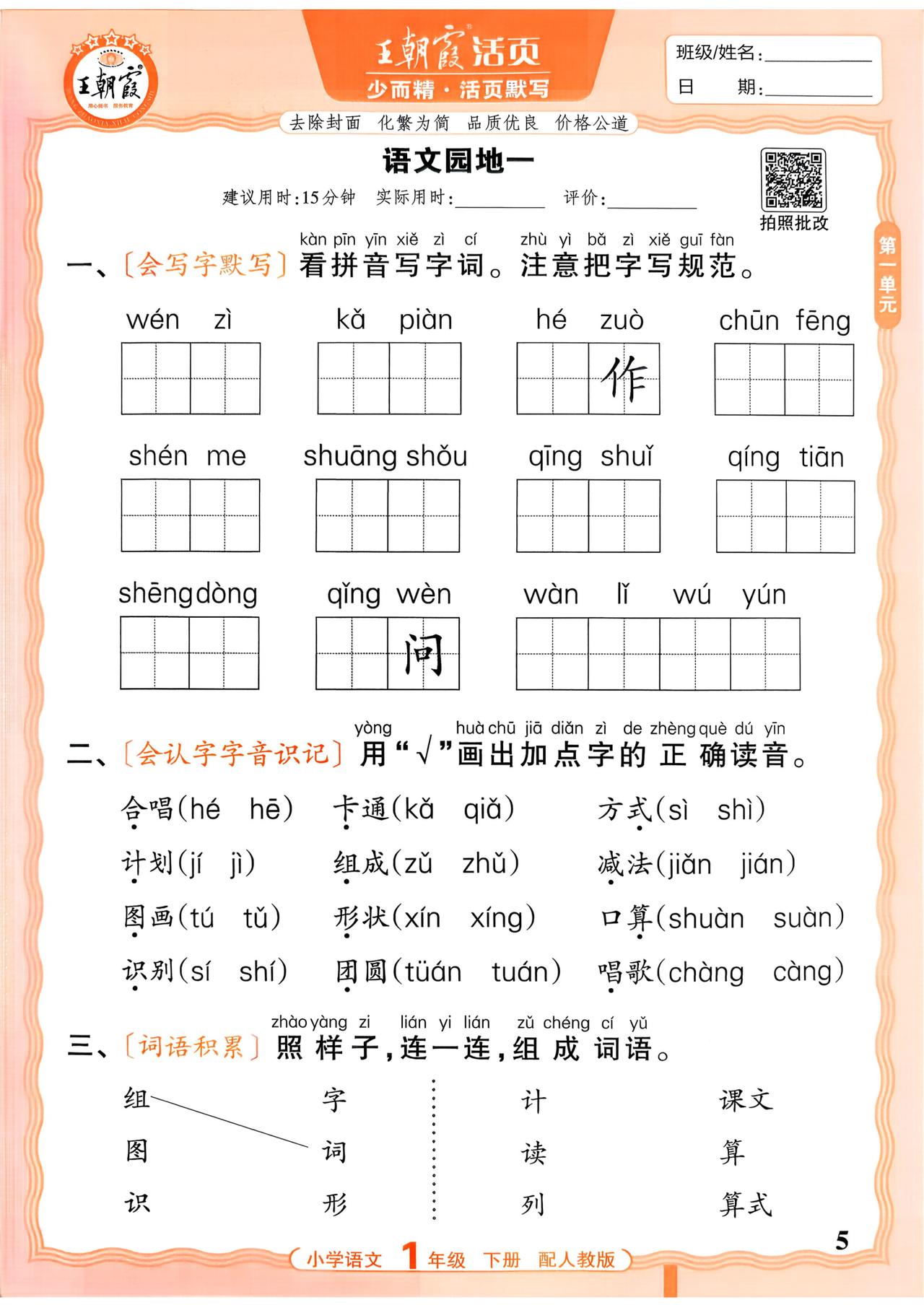 26春一年级下册语文,第一单元基础知识活页默写+参考答案,收藏备用