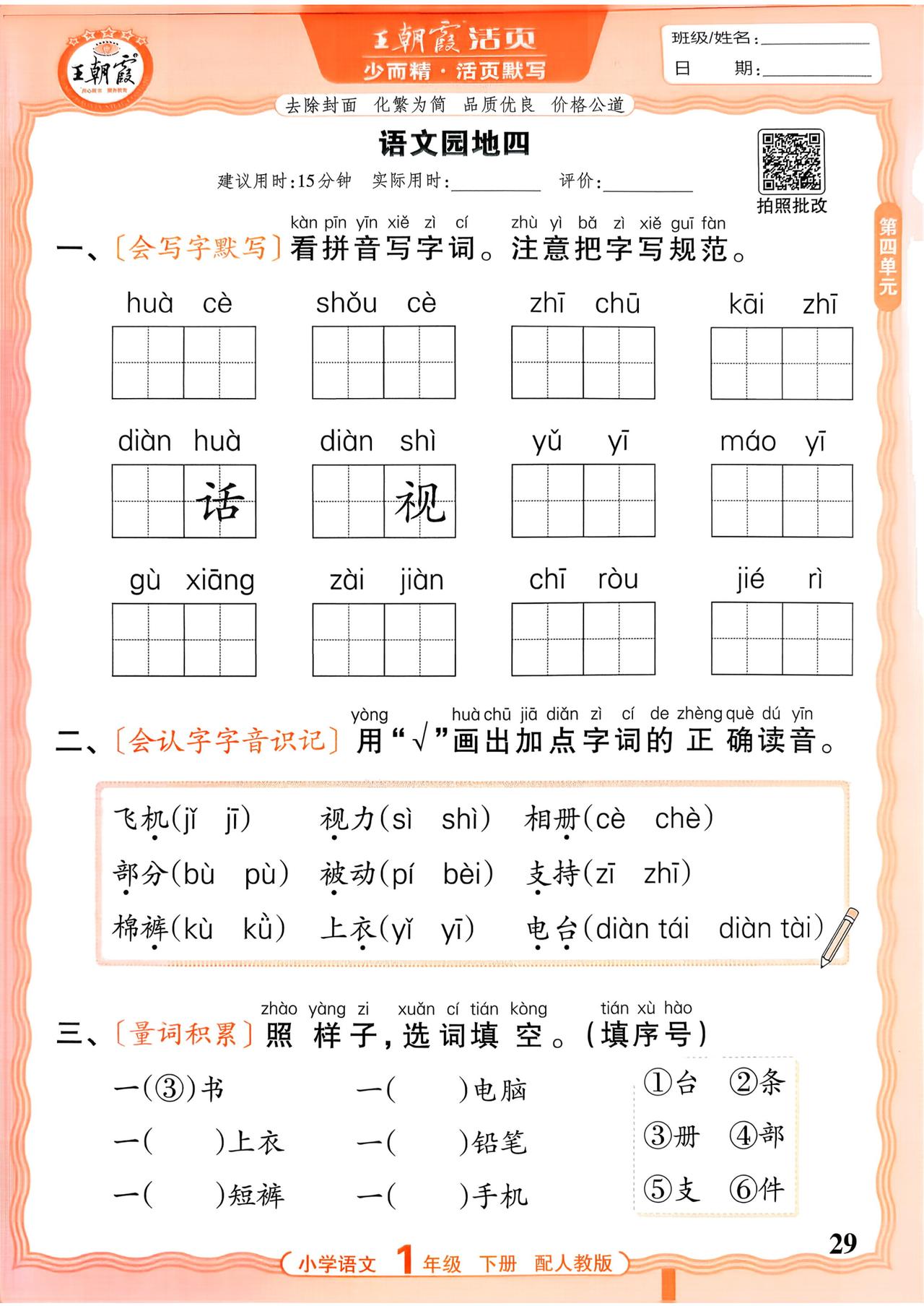 26春一年级下册语文,第四单元基础知识活页默写+期中综合练习+参考答案,收藏备用