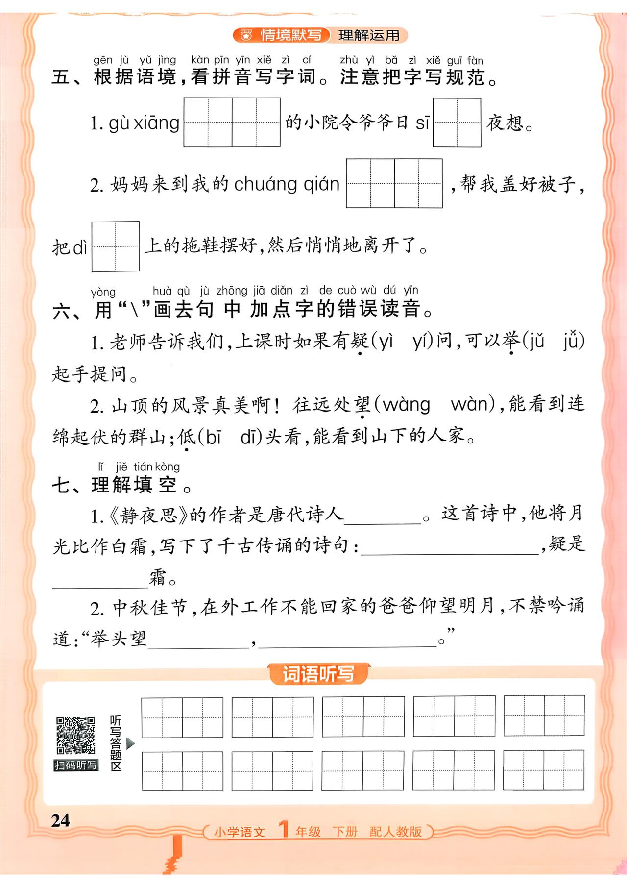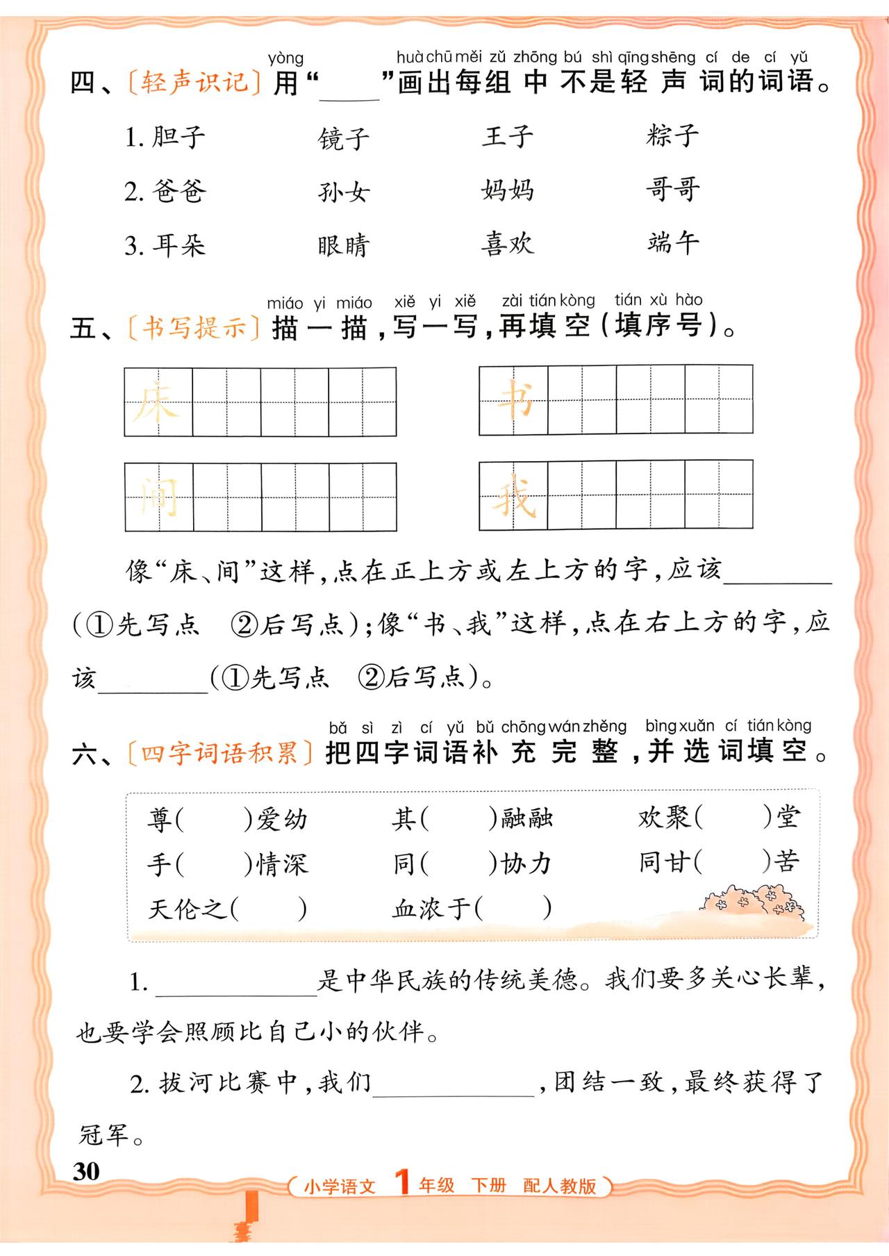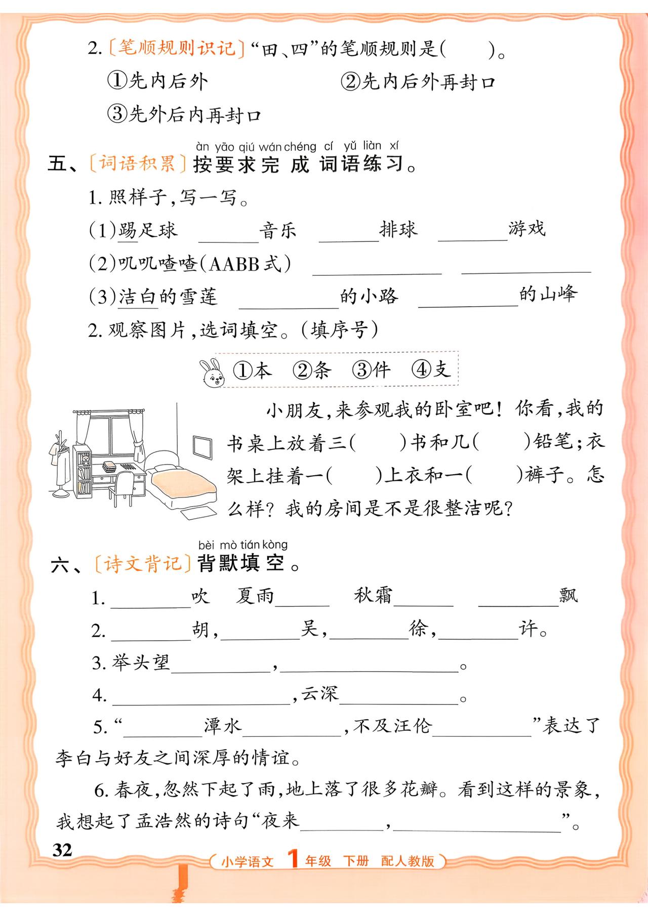 一年级下册语文期中复习,看拼音写词语、量词、四字词语、特殊词语、多音字组词、近义