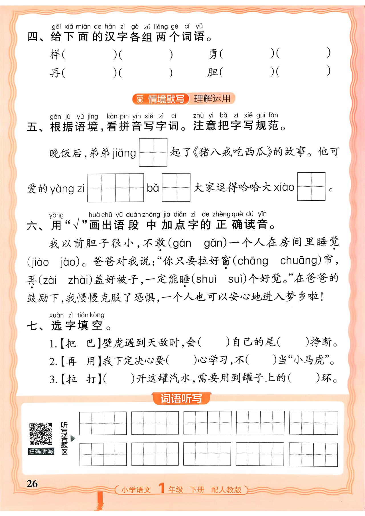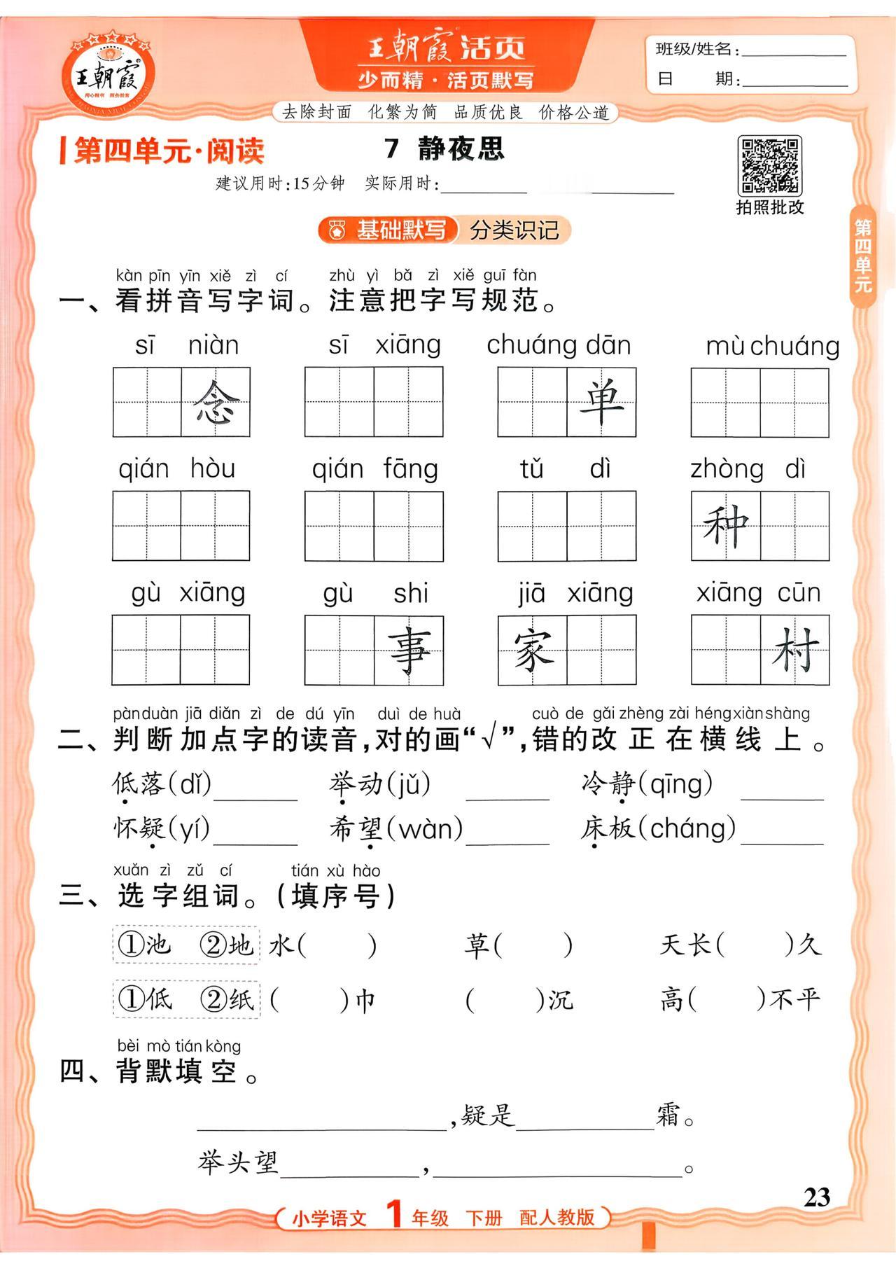 26春一年级下册语文,第七单元基础知识活页默写+参考答案,收藏备用