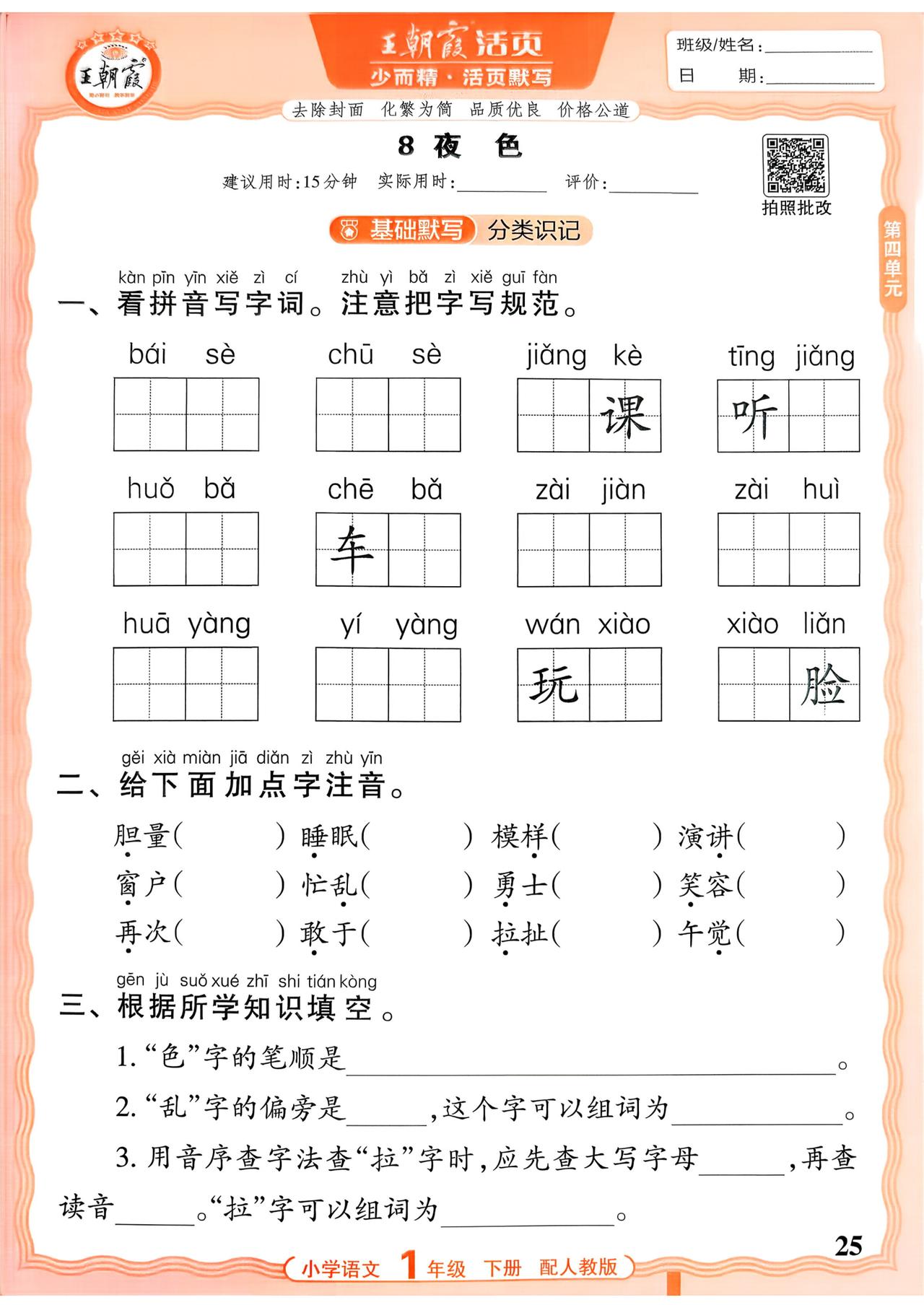 26春一年级下册语文,第八单元基础知识活页默写+参考答案,收藏备用