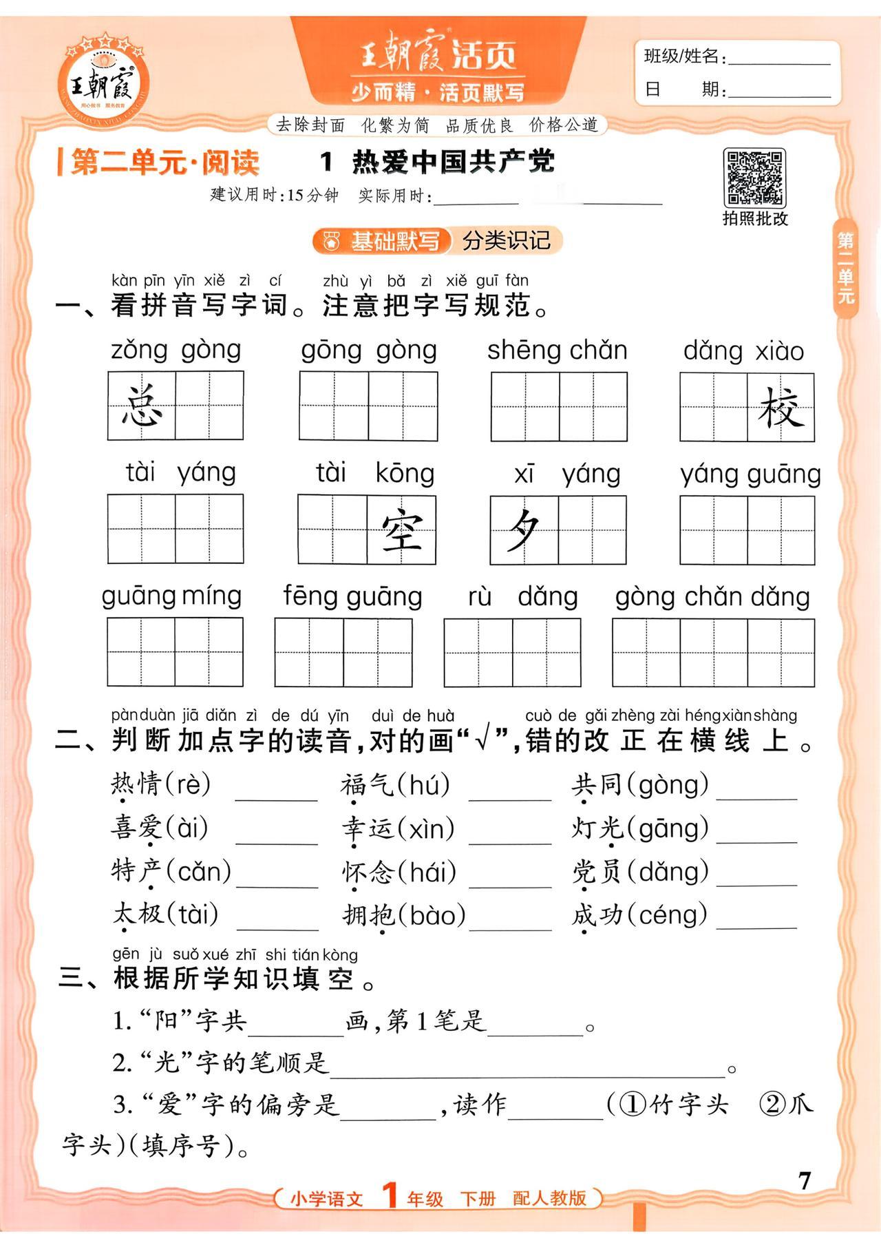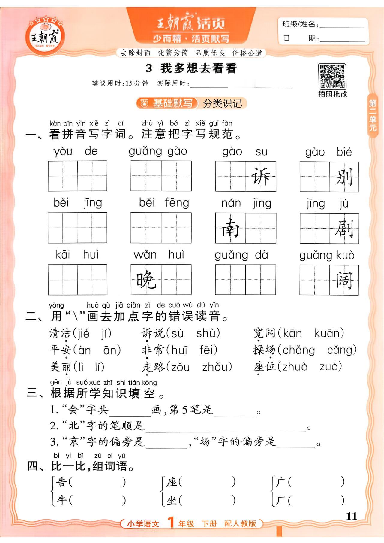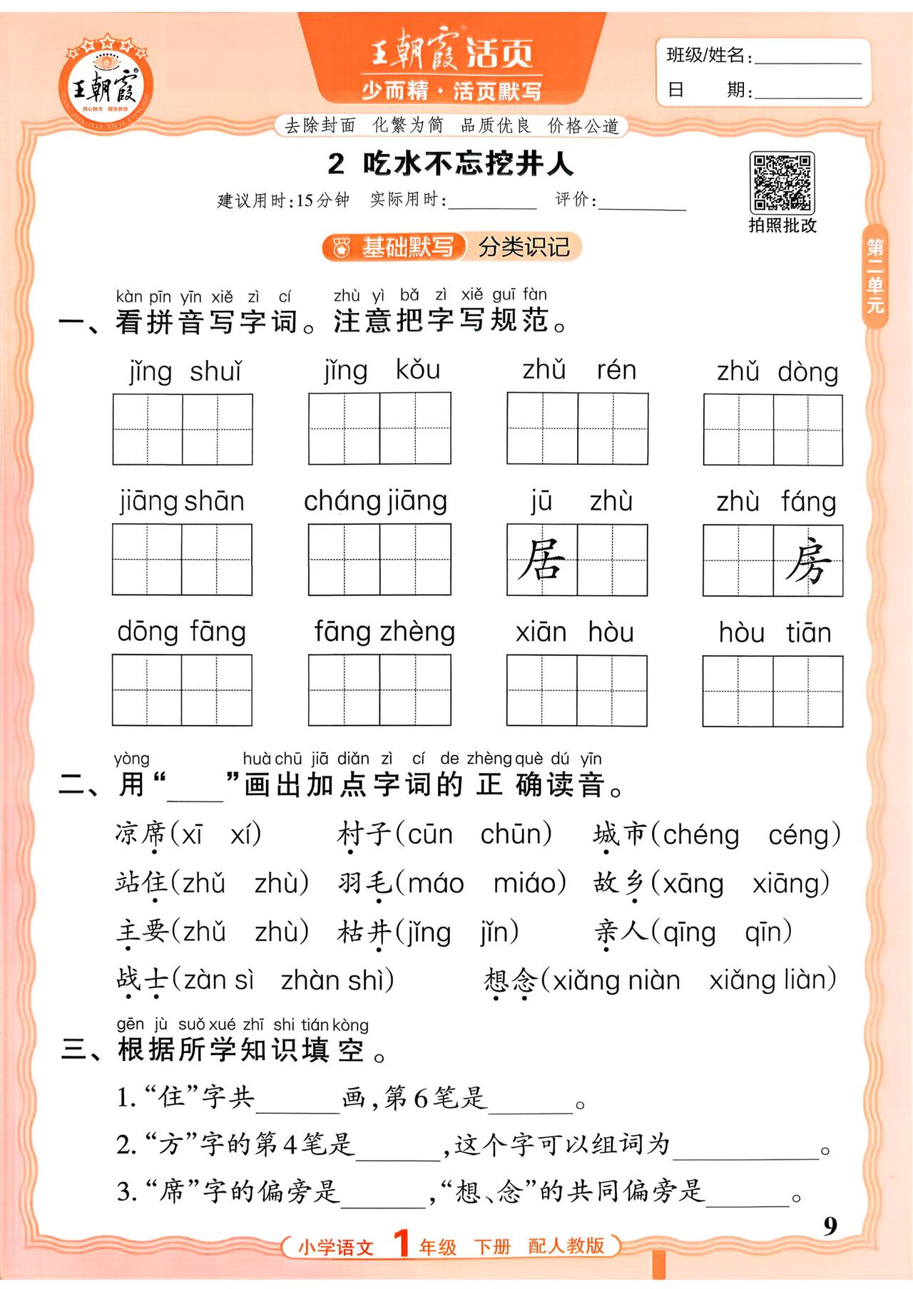 26春一年级下册语文,第二单元基础知识活页默写+参考答案,收藏备用