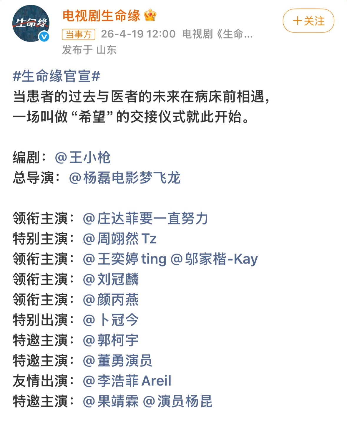 生命缘官宣新剧官宣,阵容👇👇编剧:领衔主演:领衔主演:领衔主演:特邀主演:友情出演: