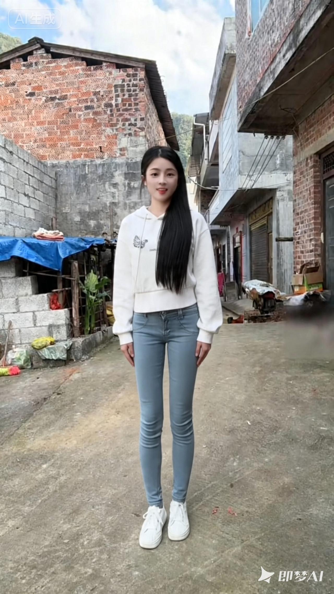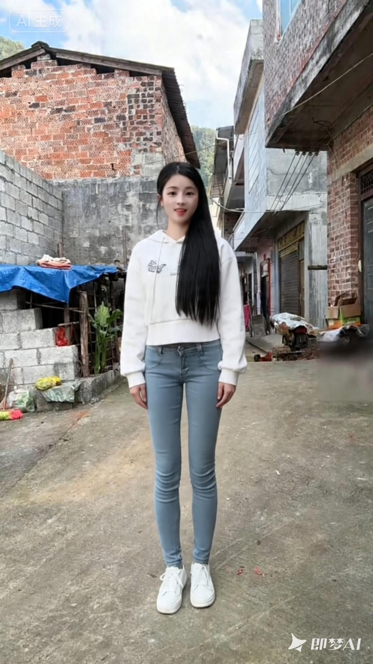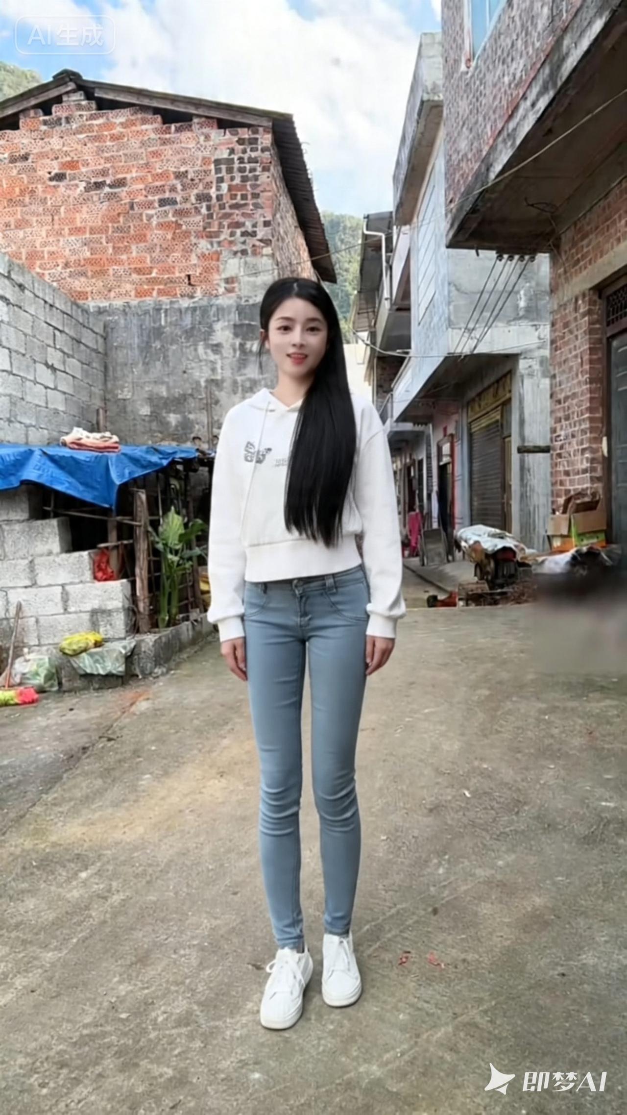 长头发美女穿着白色卫衣站在中间,周围还有瓦房