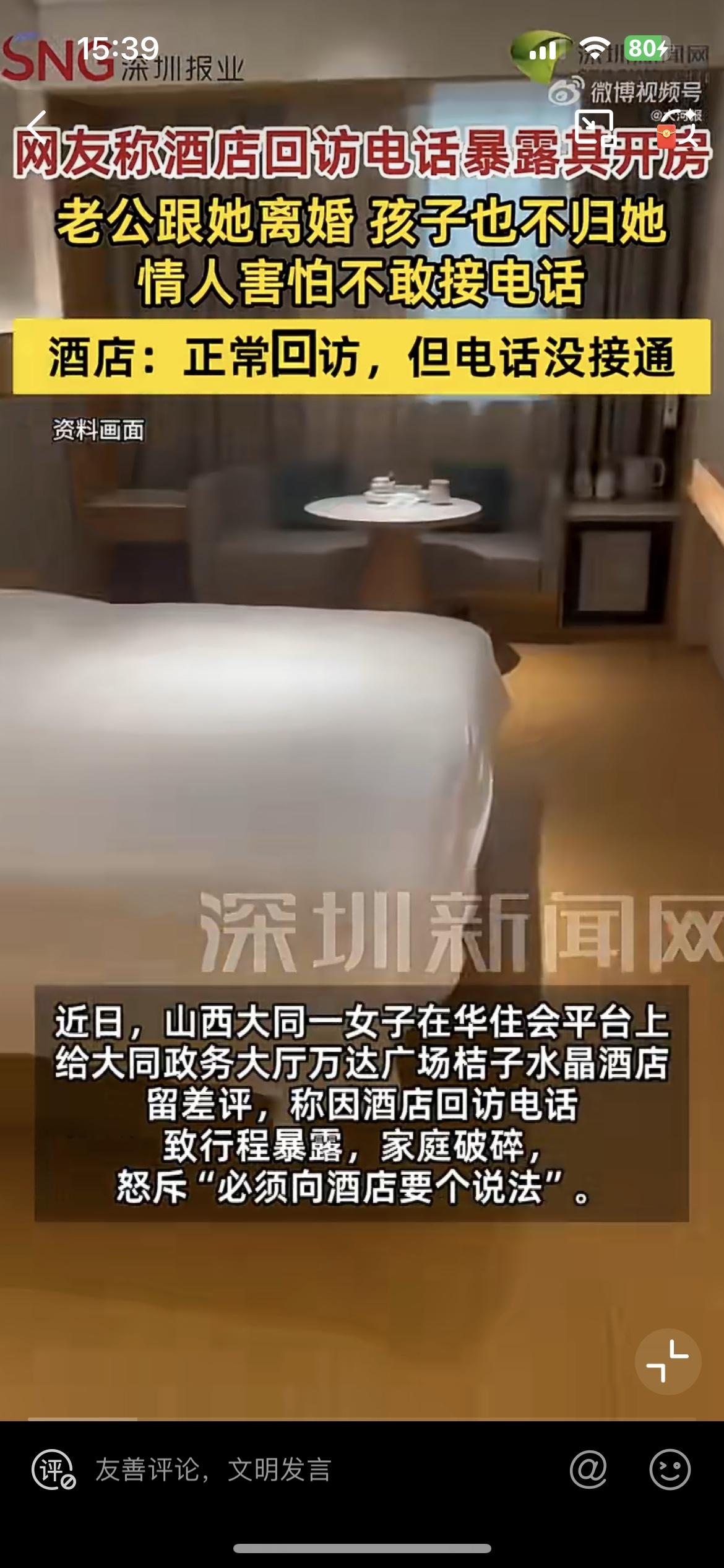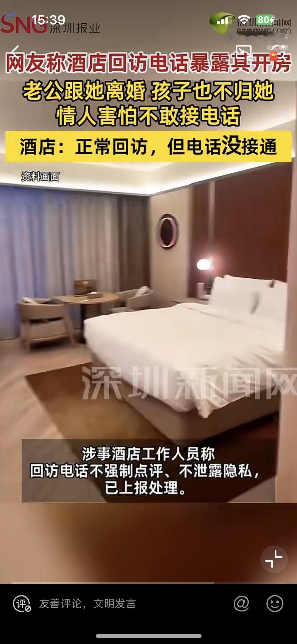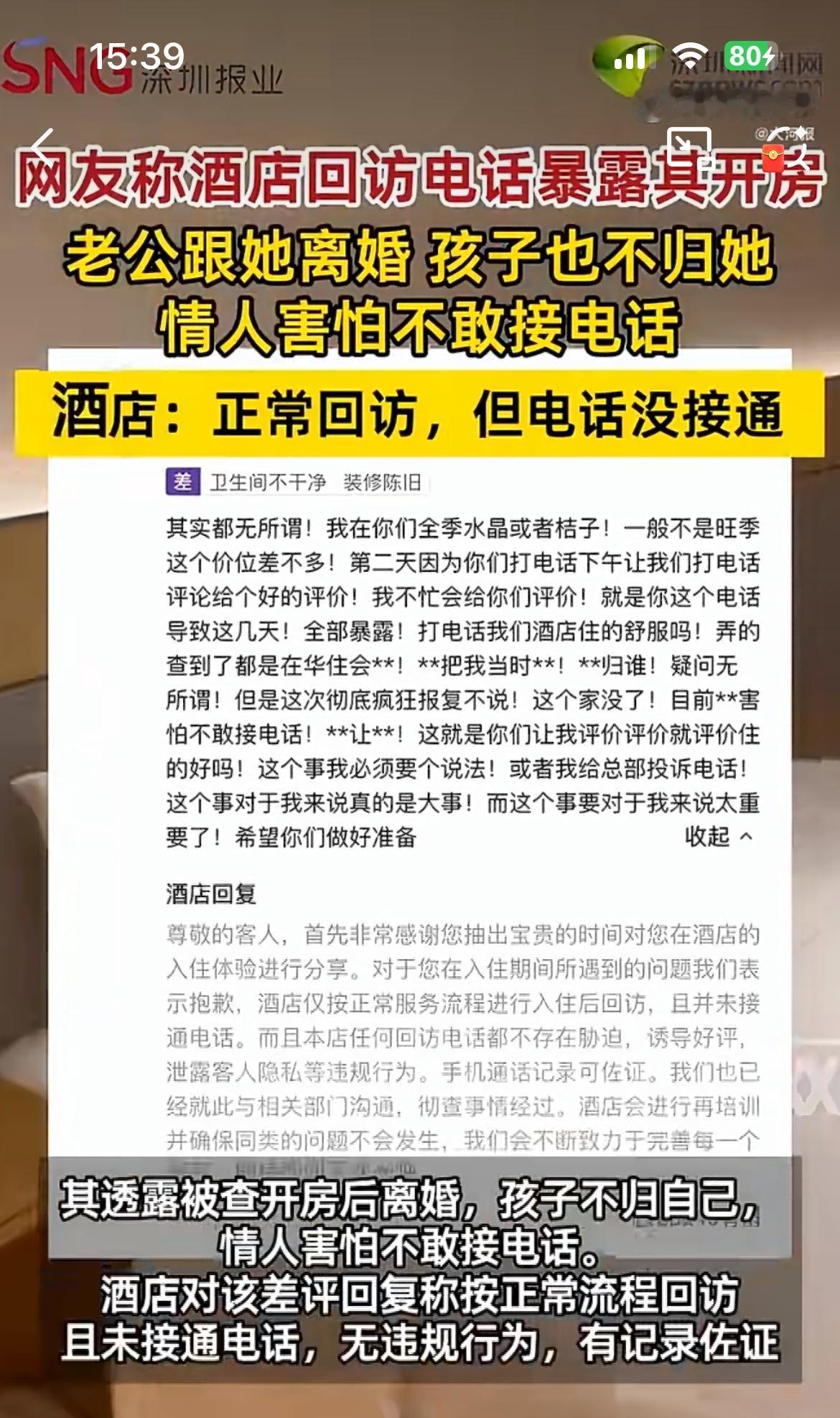 酒店回访电话意外暴露女子行踪,被老公查到开房记录,导致家庭破裂,女子反手给当事酒店一个差评。现在女子家没了,想找酒店一个说法。 这个女人真的是猪八戒照镜子,转圈丢人,自己做了亏心事,终究是纸包不住火,迟早被老公发现。酒店例行回访是职责所在,并没有侵犯隐私。作为工作人员并不知道你住酒店,到底是为何?是出差还是有别的目的?这是你的隐私。酒店要承担什么责任?纯粹是自己对感情不负责任,做了对不起老公的事情才导致的,所有的后果应该她一个人承担才对。