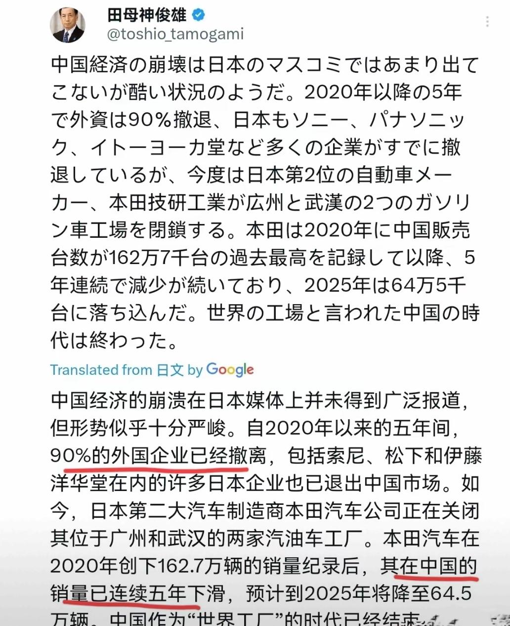 日本前航空幕僚长田母神俊雄声称,中国时代已然终结!4月19日,田母神俊雄表示,虽然日本媒体很少报道“中国经济崩溃”,但情况似乎十分严峻。 4月19日,日本那位老熟人田母神俊雄又出来喊话了,他一口咬定从2020年到现在的五年间,外资已经跑了九成,他还拿索尼和松下举例子,斩钉截铁地说中国时代彻底走到头了。 这话听着挺唬人,其实全是糊弄老百姓的迷魂药,资金从来不听政客忽悠,资本的身体永远最诚实。 大家仔细看看2025年1到9月的真金白银流水,全国整体实际使用外资金额确实降了10.4%,可日本对华实际投资不仅没跑,反而逆势暴涨了55.5%。 这就很有意思了,如果真像他说的那样天塌了,日本老板们怎么还拼了命地往里砸钱?根据中国日本商会的调查,将近六成的在华日企都打算在2026年继续加码。 退出去的到底是谁?其实是那些过去单纯靠咱们廉价劳动力挣辛苦钱的低端流水线。 真正聪明的大资金,正削尖了脑袋挤进人工智能、6G和动力电池这些高端局,这不是什么外资大撤退,这就是一场残酷的产业大洗牌。 田母神俊雄这次还特意拎出了本田关厂的事儿当炮弹,日本第二大车企本田,确实要关掉广州和武汉的两家燃油车工厂。 在右翼政客嘴里,这就成了中国大环境不行的铁证,这完全是倒打一耙,本田关厂根本不是水土不服,而是旧饭碗真端不住了。 咱们翻开本田这几年的账本算算明细,2020年的时候,本田在中国一年能卖出162.7万辆车,那时候可谓风光无限。 到了2025年,这个数字直接雪崩到了64.53万辆,等到了2026年第一季度,销量更是只剩下惨淡的12.2万辆,连当年的零头都够不上。 车卖不动,生产线自然就得吃灰,现在本田在中国的产能利用率已经跌到了50%左右,一半的机器都在睡大觉。 这种情况下,不赶紧关掉多余的燃油车工厂止血,难道留着过年吗?这分明是技术和价格双输之后的断臂求生。 最打脸的是,本田前脚刚关了旧厂,后脚就在广州和武汉悄悄盖起了新厂,两座年产能各12万辆的电动汽车专属工厂正在拔地而起。 这哪里是想放弃中国市场,这分明是老赛道玩砸了,想换个新能源的牌桌重新发牌。 以前日本车企仗着燃油车技术好,脾气特别大,死抱着油车不放,等他们终于反应过来要造电动车时,黄花菜都凉透了。 中国品牌早就在这条新赛道上跑没影了,2026年一季度,中国新能源汽车出口直接干到了95.4万辆,同比暴增120%。 更厉害的是3月单月出口创下37.1万辆的历史新高,放眼整个全球市场,中国新能源乘用车的地盘已经超过了62%。 也就是说,全世界每卖出十辆新能源车,就有六辆是我们造的,现在日系车推出的电动产品,技术跟不上,价格还死贵。 被中国品牌降维打击,完全是他们过去傲慢和短视结出的苦果,连老本行都守不住了,这就叫被市场狠狠教育。 回头再看田母神俊雄这套言论,逻辑简直漏洞百出,他其实就是受不了日本传统优势产业正在全面衰退的现实。 把自家企业技术迭代慢、市场反应迟钝导致的溃败,硬生生甩锅给别人,这不过是躲在屋里骗自己的一针麻醉剂。 经济发展从来不讲人情,市场规律更不会为了几句口号让路,靠几句狠话根本关不掉隆隆作响的机器。 不仅外贸底盘稳如泰山,咱们的产业升级更是在大步快跑,现在真正走到尽头的,是日本传统产业一招鲜吃遍天的旧时代。 这也是中国单纯依靠廉价劳动力的世界工厂旧剧本面临的谢幕,咱们国家正猛踩油门,从粗放制造大步跨向高端智造。 在这个历史进程中,跑得慢的企业注定要被无情淘汰出局,能跟上这波大浪的资本,就能在这里切下最大的蛋糕,这是清清楚楚的阳谋,谁也拦不住。 对此大家有什么想说的呢?欢迎在评论区留言讨论,说出您的想法!