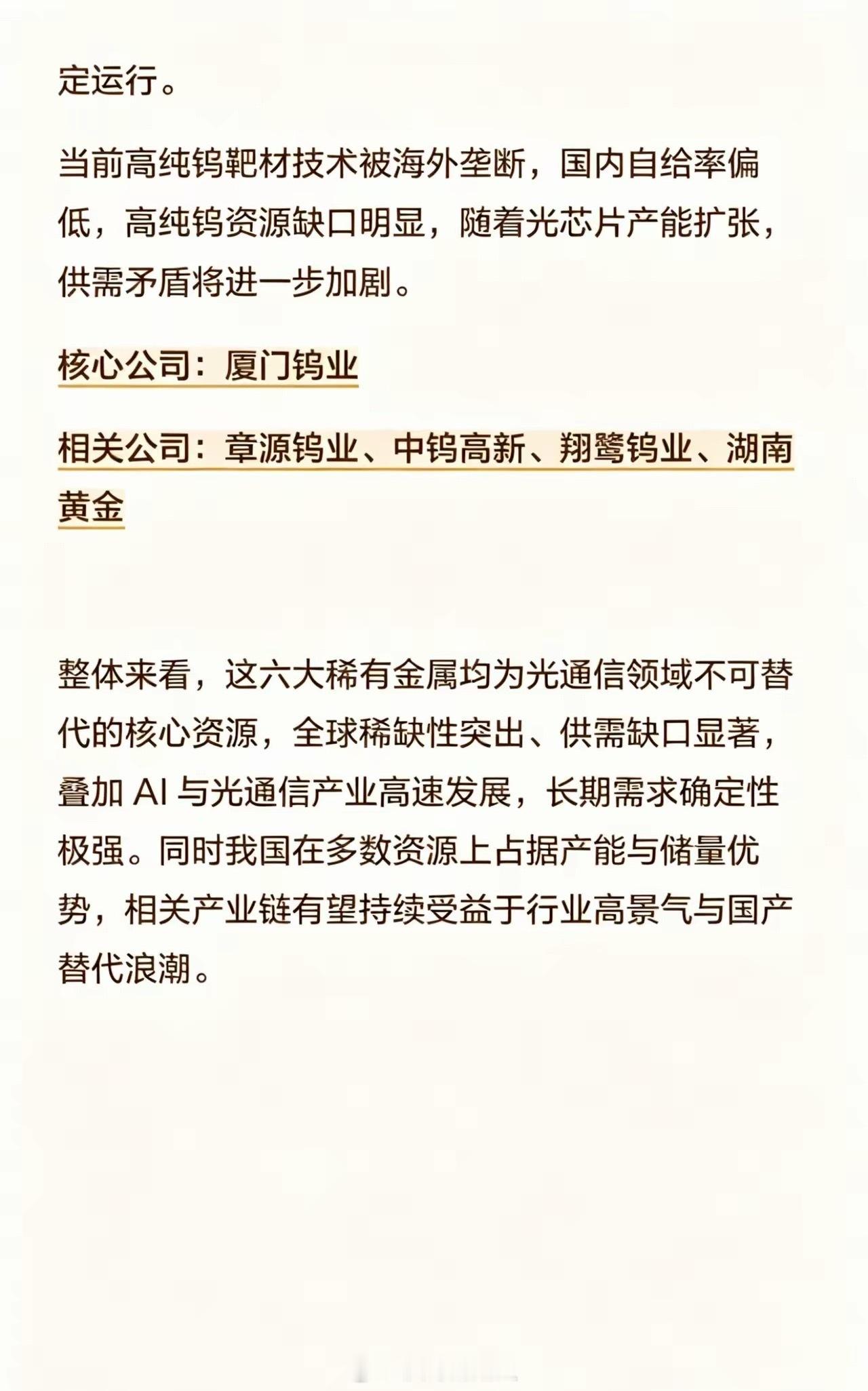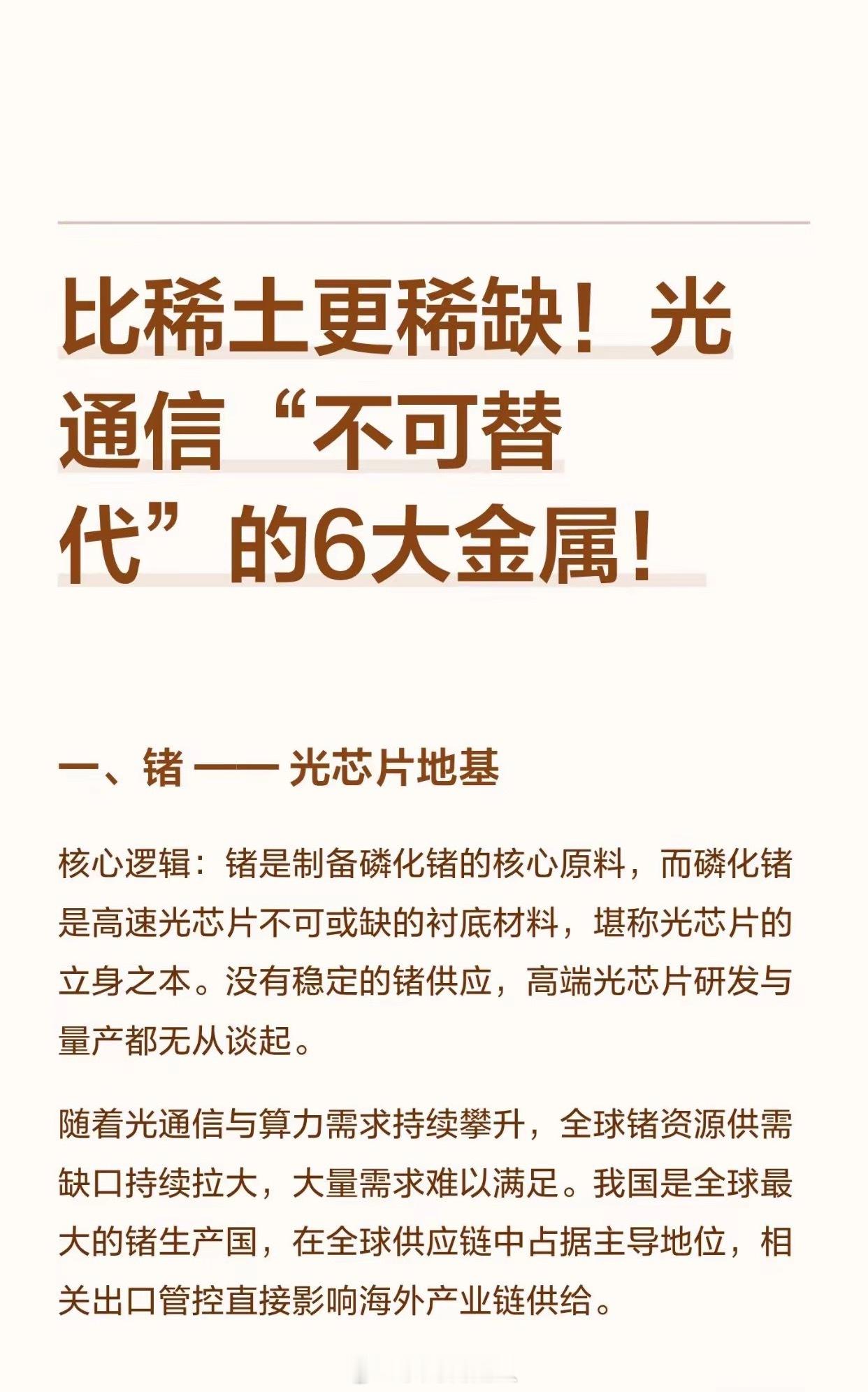 比稀土更稀缺!光通信“不可替代”的6大金在AI算力狂飙、光通信全面升级的2026年,一场围绕“关键金属”的全球争夺战正在悄然上演。这些金属,虽不起眼,却如同工业的“维生素”,是光芯片、光模块、高速光纤等核心技术的命脉所在。它们比黄金更稀缺,比稀土更关键,一旦断供,整个光通信产业链或将瞬间停摆。今天,我们深度梳理光通信领域最“卡脖子”的六大战略金属,揭开它们背后的技术壁垒、供需危机与国产突围之路。