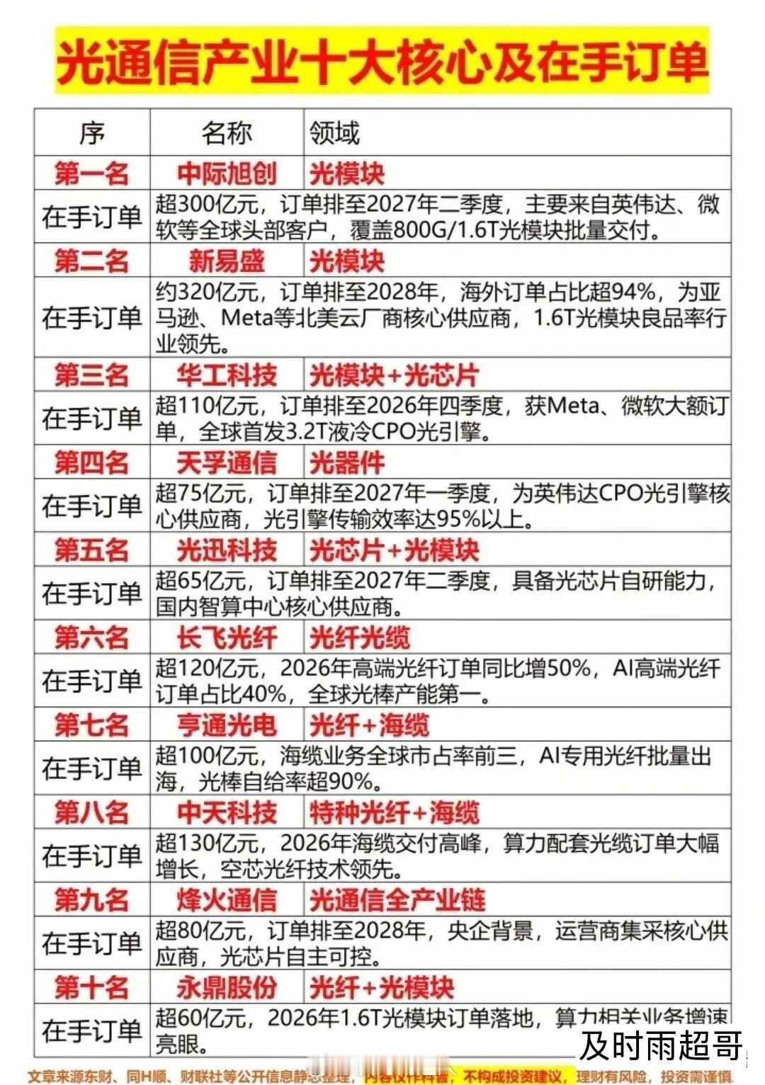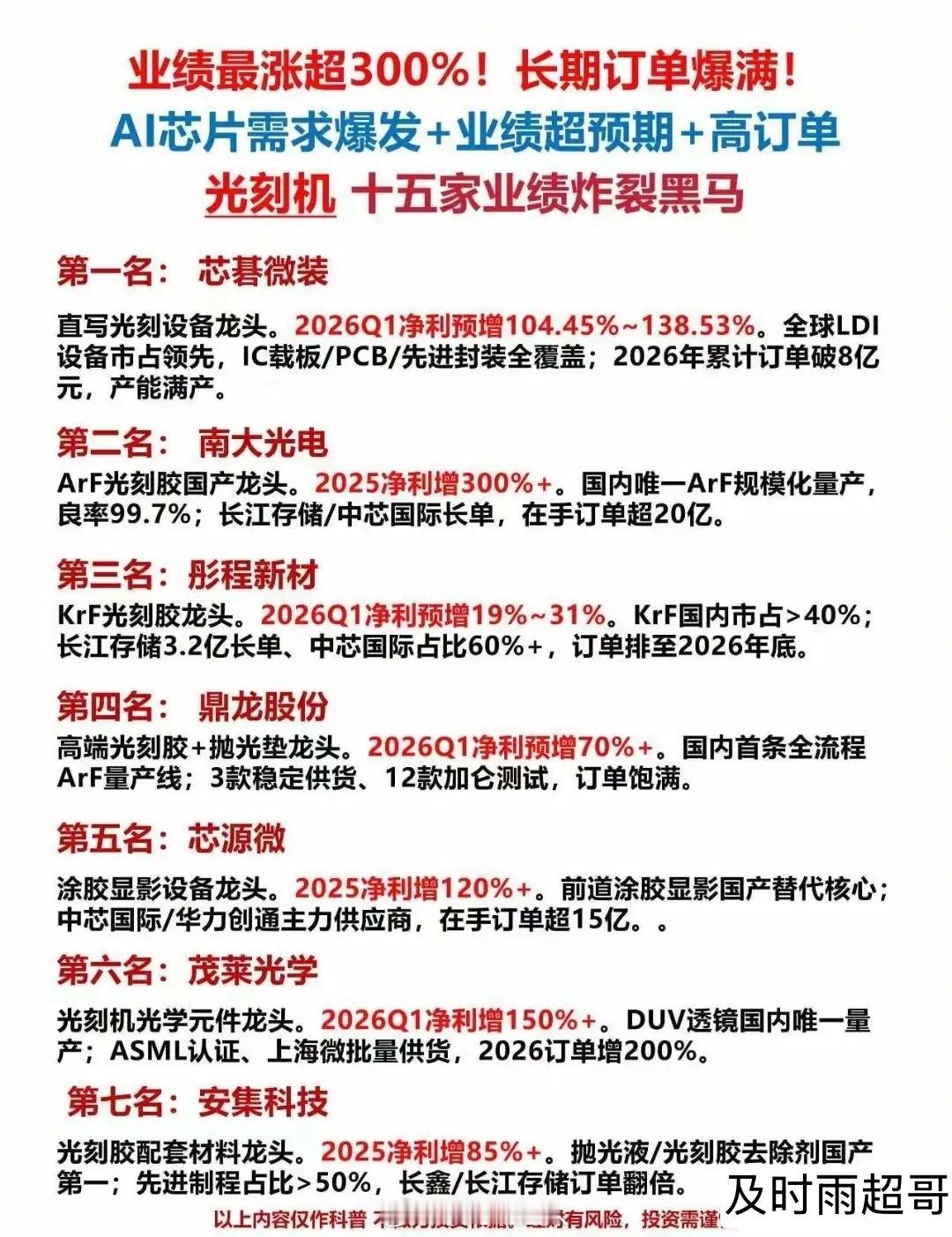 🔥 光刻机15家业绩炸裂黑马!最高暴增300%+,订单直接排到明年!家人们!AI芯片需求大爆发,直接带飞整个光刻机产业链!15家硬核黑马集体交出超预期答卷,净利翻倍、订单爆满,国产替代的速度快到超出想象!芯碁微装:直写光刻设备龙头,2026年累计订单破8亿,产能直接拉满!南大光电:ArF光刻胶国产龙头,在手订单超20亿!彤程新材:KrF光刻胶龙头,订单直接排到2026年底!福晶科技:光刻机光源核心部件龙头,2025净利增60%+,2026订单增80%!奥普光电:光刻机双工件台核心,2025净利增75%+,专项订单超5亿! 苏大维格:光刻机光栅尺龙头,2025净利增130%+,2026专项订单增200%!晶瑞电材:G/I线/KrF光刻胶龙头,2026在手订单超8亿!⚠️ 以上内容仅为行业科普分享,不构成任何投资建议,股市有风险,投资需谨慎。
