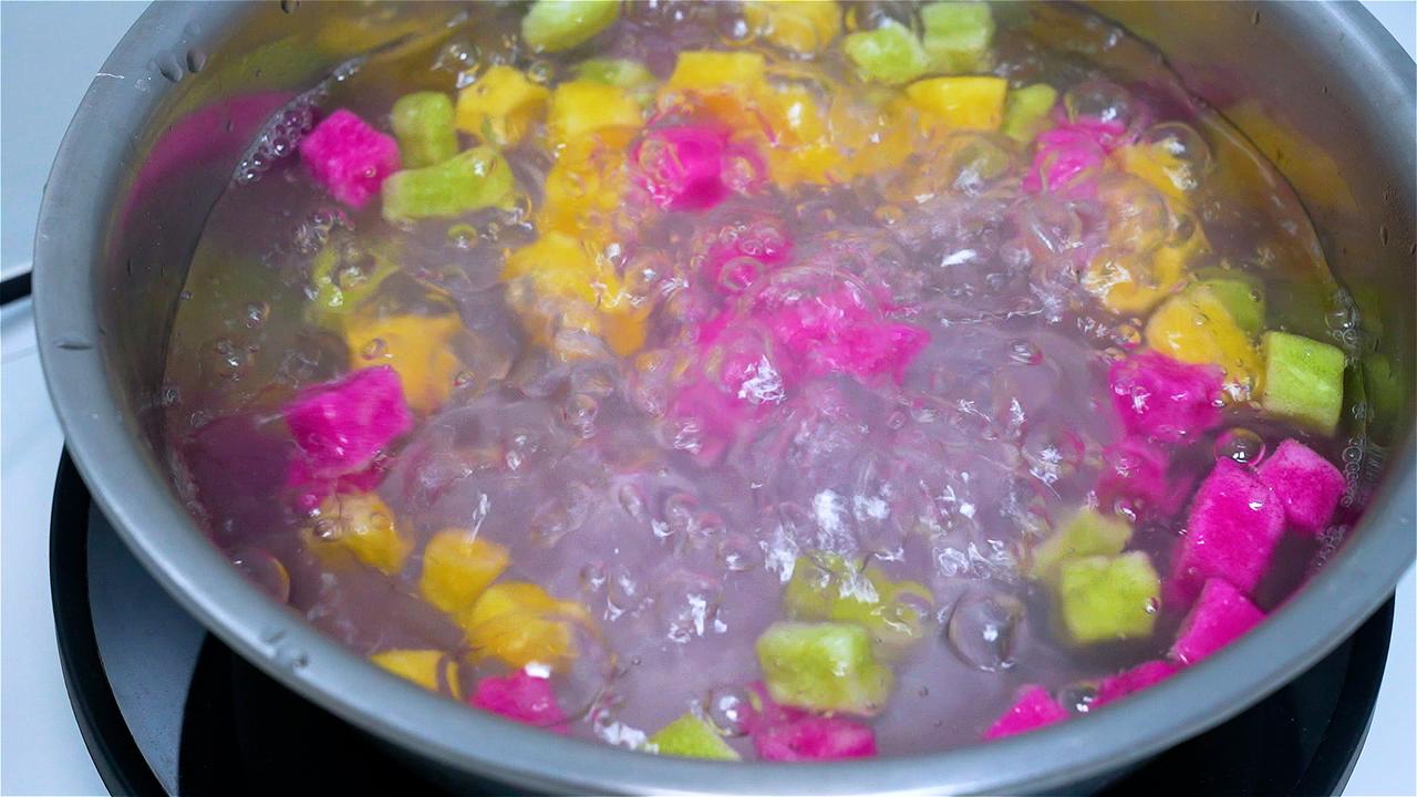 最地道的吃法,是搭配烧仙草、石花膏、红豆、薏米,浇上蜂蜜水或蔗冰糖冰水,做成一碗四果汤。舀一勺入口,阿达子软糯有嚼劲,带着果香,与冰凉爽滑的配料交织在一起。夏天来一碗,暑气全消。