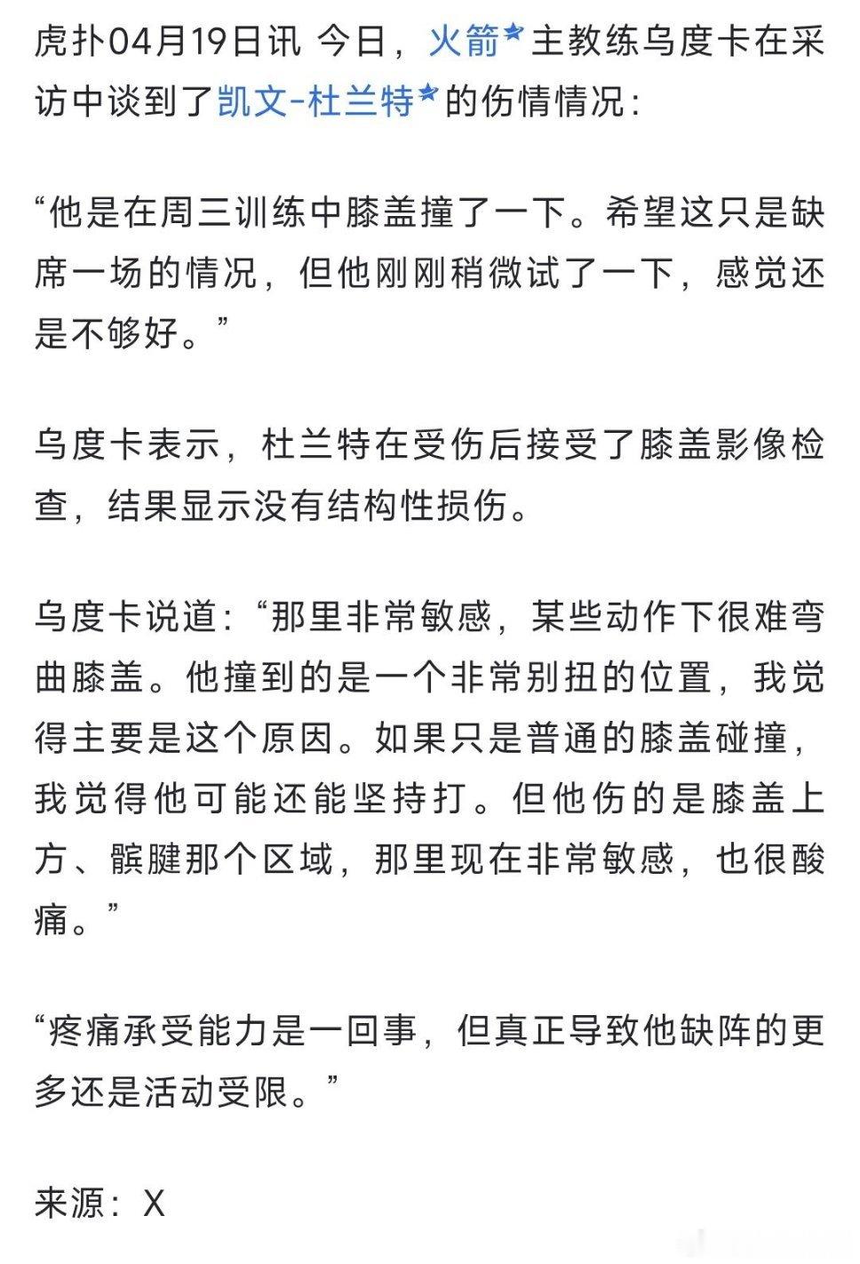 考虑到季后赛比常规赛更重要,我预估他会在G3或G4复出,但这还是得看KD本人对膝盖的反应:如果明后天膝盖表现良好,最乐观的情况下G2复出也不无可能;反之,如果有变向剧痛,甚至膝盖积液等等不良反应,这个修整期还有可能会延长至G4之后