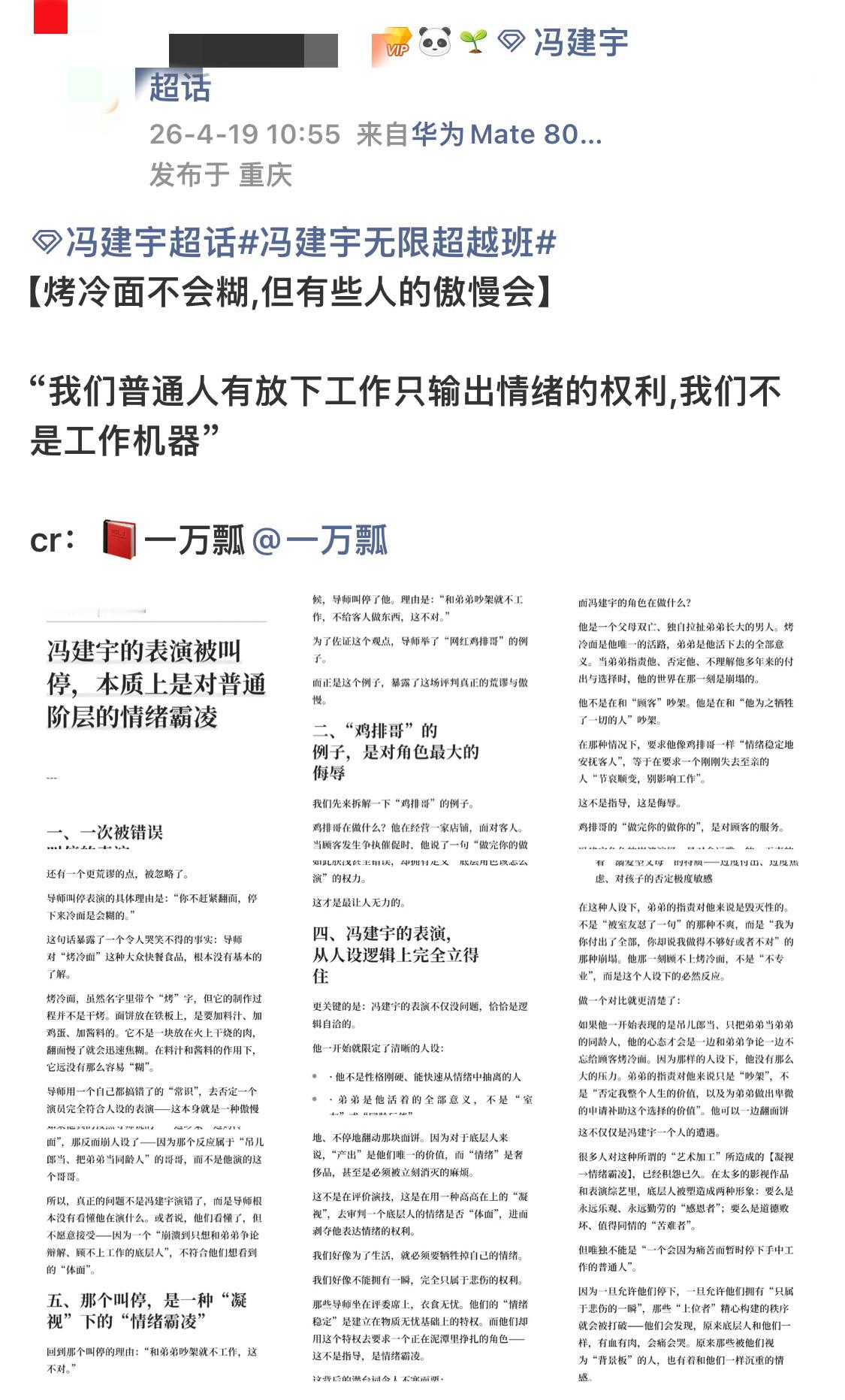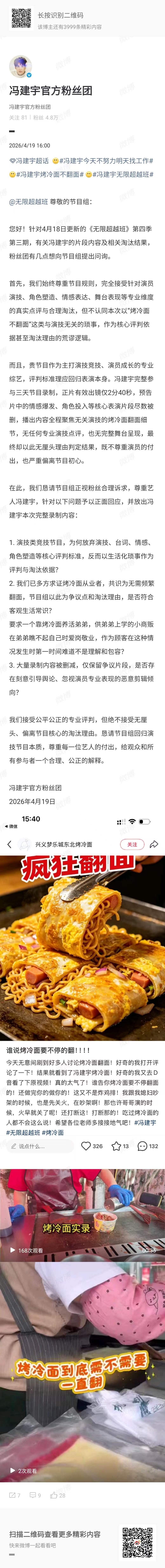 冯建宇因烤冷面不翻面被淘汰冯建宇后援会维权声明 《无限超越班》给我看的一愣一愣的,冯建宇被淘汰因为他扮演烤冷面小哥跟他弟吵架的时候手没有去翻烤冷面、、、你可以说他情绪不对 台词不好 表演不好,但你说因为烤冷面不翻面是不是有点离谱了