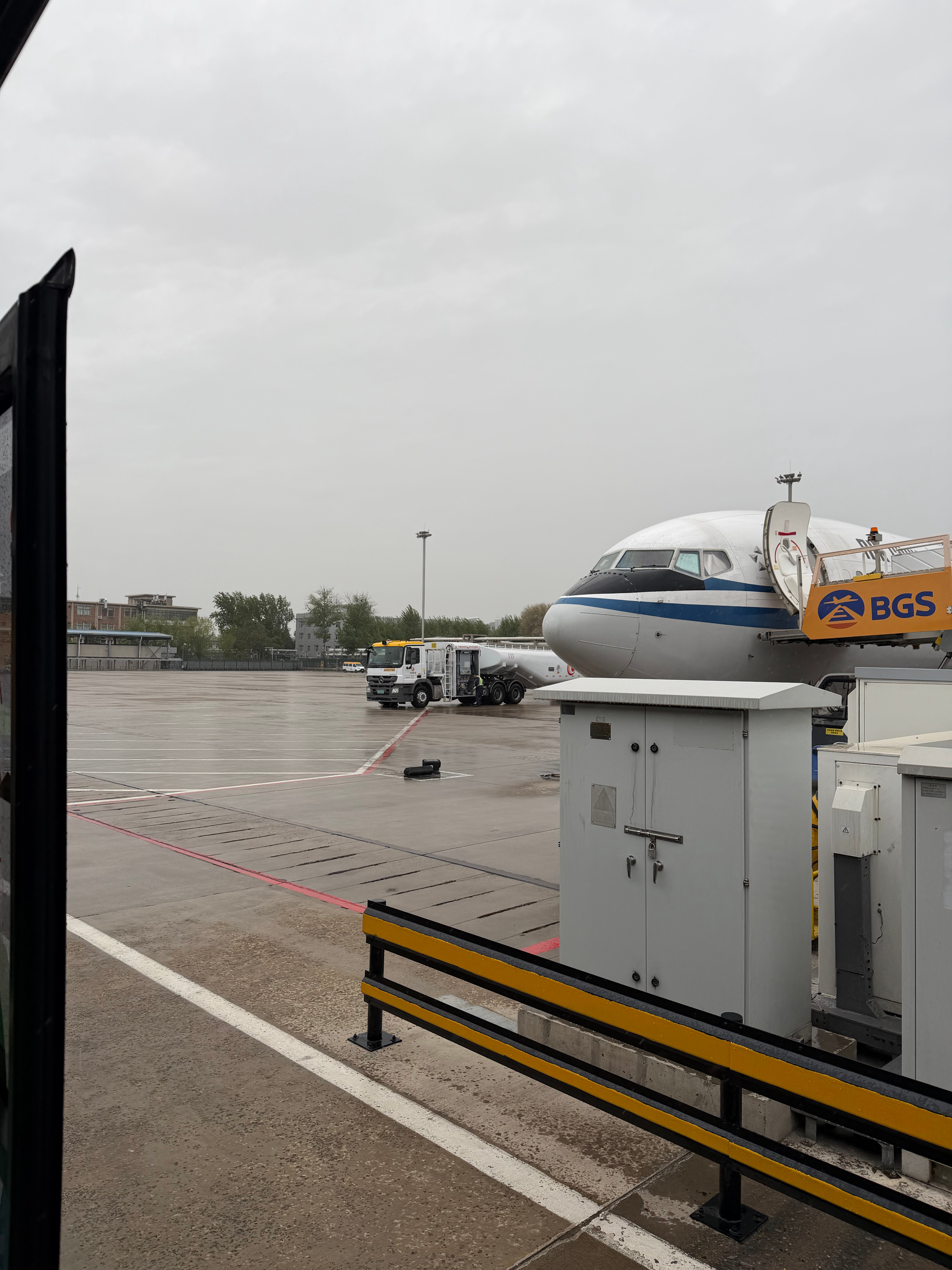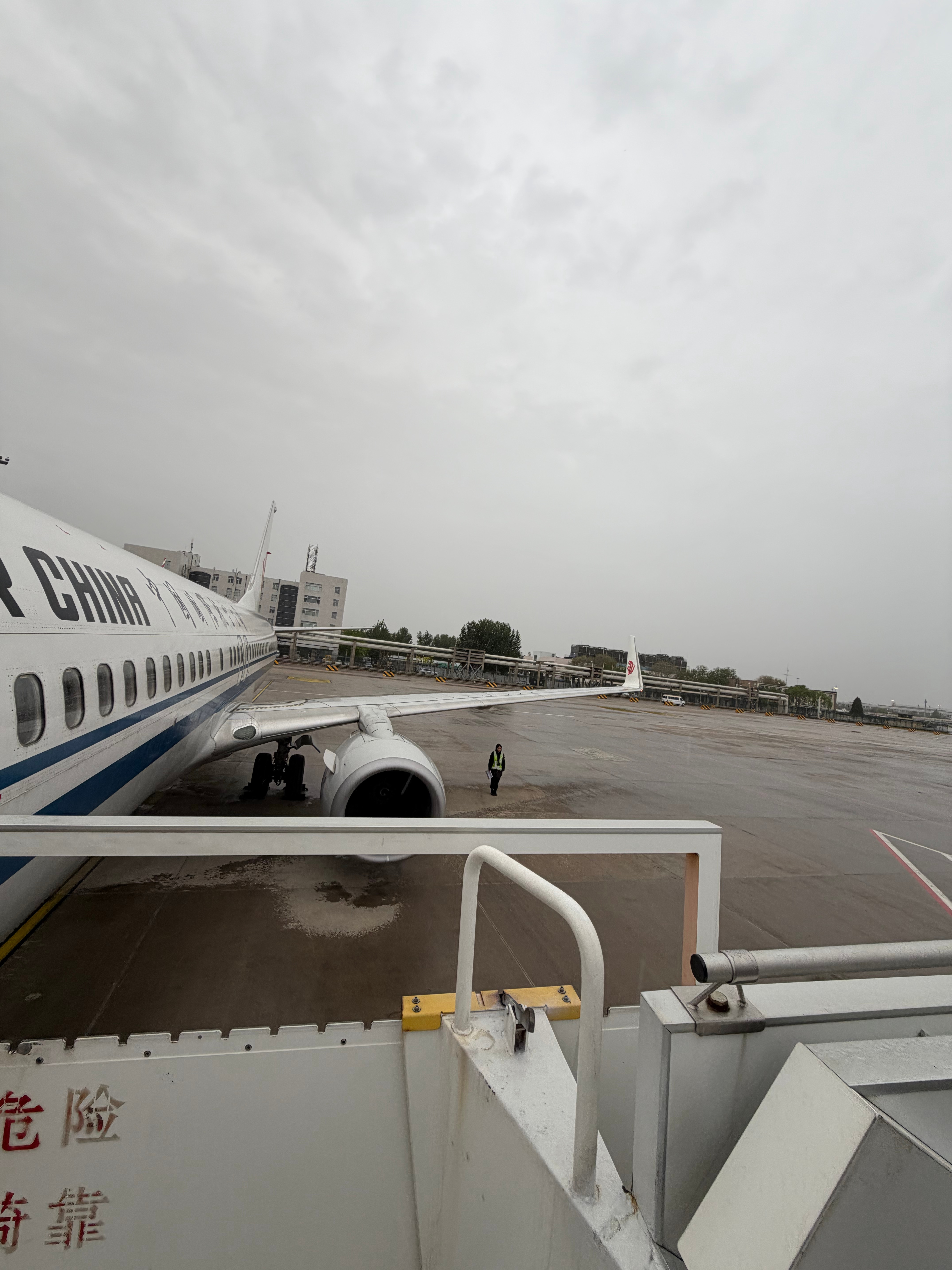 落地远机位,刚滑倒机位开始下雨,梯子没有雨棚,出机舱生淋雨,北京这个雨我都能闻得到一股泥土味。