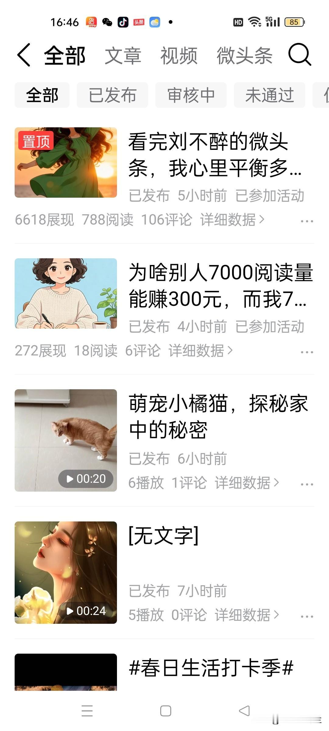 终于体会到了99+的快乐,刚才打开头条,居然看到了消息显示99+,好久没有这么多的消息了,看到99+真好太开心! 我马上打开创作中心看了一下,看看是不是有爆款了,这么多评论看样子会爆啊! 上午我只发了两条微头条,一看其中一篇微头条有788个阅读量,还有一篇只有18个阅读量。 评论都是来自788阅读量的微头条,居然有106条评论,太意外了,没想到我的微头条没爆,评论区好像要爆了。 其实这篇微头条我就是写的大咖的流量也不太好,结果很多友友留下了评论。 还有友友说,在我眼里,你也是大咖!比我们这些小虾米强太多了。 一位友友这样说,写的真好,娓娓道来,你也是大咖呀! 友友们夸的我都不好意思了,看到友友们的鼓励,我特别有动力,本来最近写两个平台的小作文有点顾不过来了,更新的比较少,没想到友友们还是这么热情,太感谢友友们的鼓励了。 以后我还是要认真写头条,不管有没有展现量,都要坚持更新,收益低,咱也要有这个态度。 其实这篇微头条我投了加油包,我现在有近1万加油包,不用也是浪费。 上午我看这篇微头条的阅读量还可以,就投了1000加油包,然后阅读量有点提升,下午看到阅读这么多,刚才又投了1000加油包。 加油包就是用的,我看到哪一篇阅读量不错,就投加油包看看,如果推不动,加油包还会退回来。 我现在需要一篇阅读量破千的微头条给我动力,如果阅读量有几千,就可以带动我以前的微头条。 友友们,你们的微头条如果展现量不太好,就攒着加油包,看着自己的微头条阅读量不错,就马上投加油包。 我都是投1000加油包,如果推荐量好,就再投1000,我就不信,还推不出来一篇小爆款了。 99+的时候不多,我要好好享受一下,以后继续努力,争取三天两头有99+,收益低没事儿,情绪价值必须拉满!