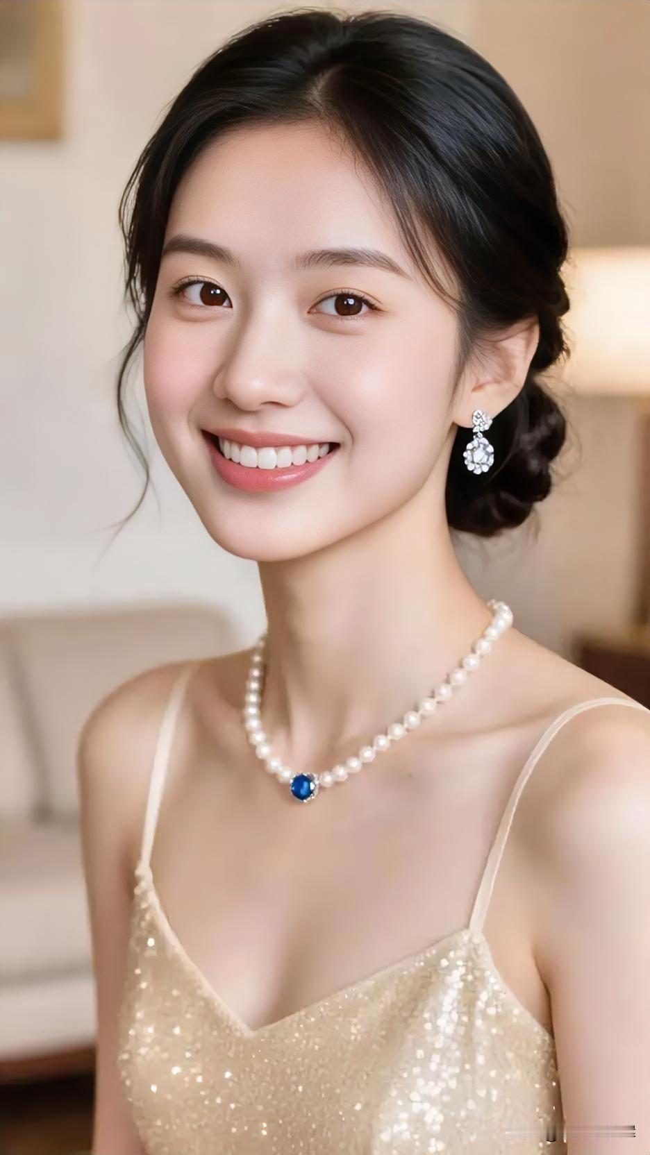 暖光轻吻她的笑靥, 珍珠项链串起温柔诗篇。 蓝宝石如星子坠入颈间, 耳畔钻光与眸中清辉相映。 金纱曳地,闪着细碎的梦, 每一缕光芒,都是优雅的注脚。