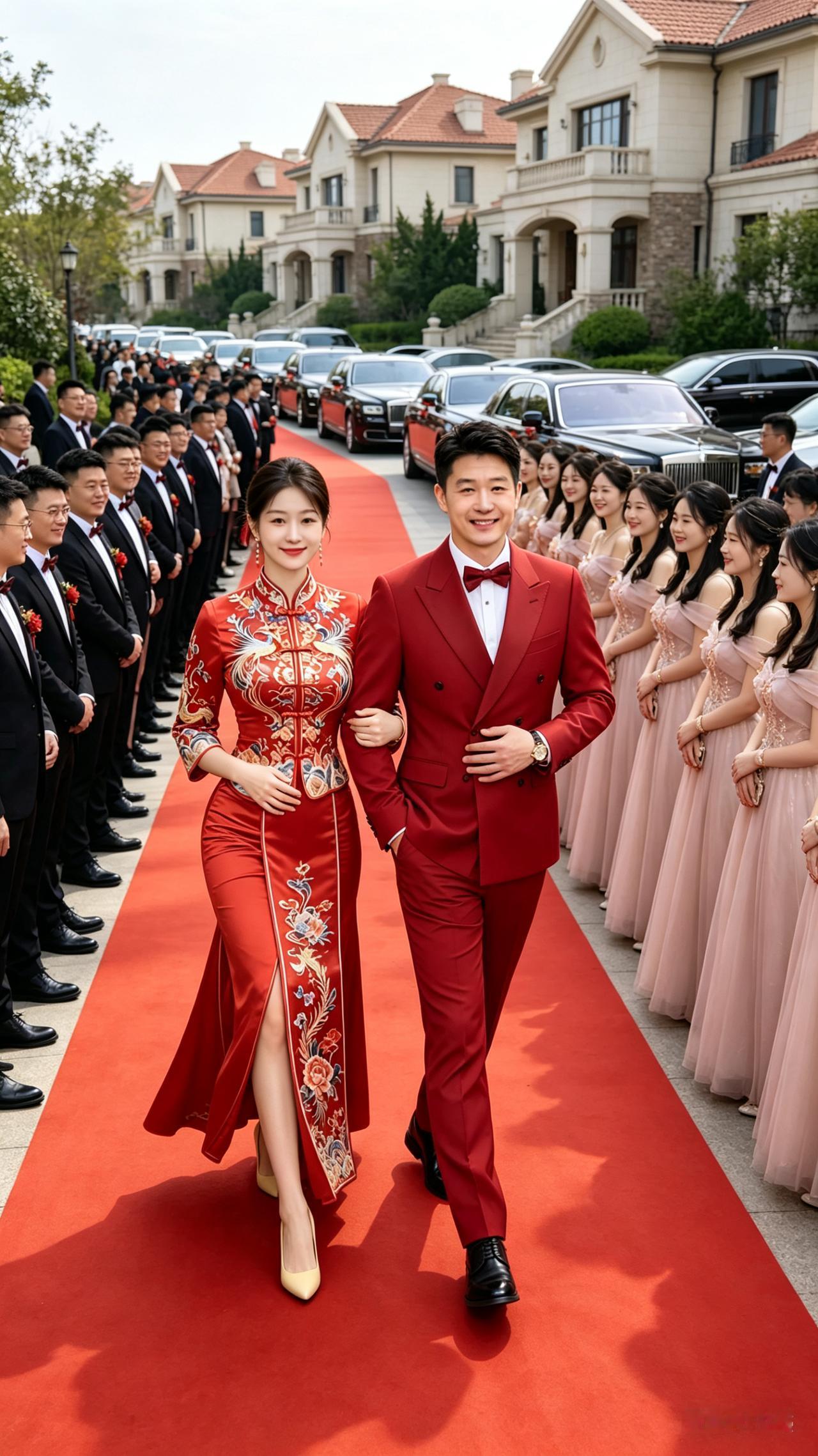 红毯迢迢情韵长, 佳人美服意轩昂。 郎披红袂牵柔荑, 女绣凤裳映容光。 豪车排阵迎良日, 亲友齐聚聚一堂。 这般婚礼真隆重, 君且评谈共语长。