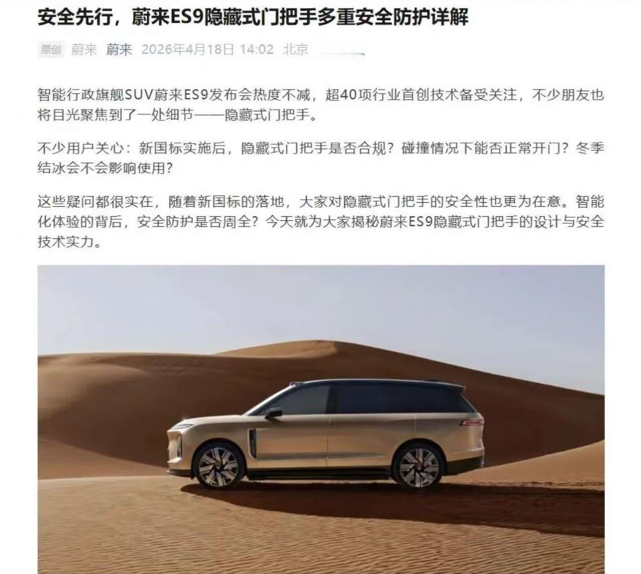 蔚来 4月18日,蔚来汽车发文回应了关于新国标实施后,ES9的隐藏式门把手是否合规等问题:目前蔚来全系在售车型,均可以正常使用隐藏式门把手,也完全合规。对于“禁止隐藏式把手”的条目,新国标的实施时间要求:2027年12月31日之前上公告的全新车型都可以使用隐藏式把手,2028年12月31日之前出厂的现款/改款车型都可以使用隐藏式把手。蔚来表示,坚决支持车内外把手的规范化管理,并持续以高于行业标准的要求约束自身。