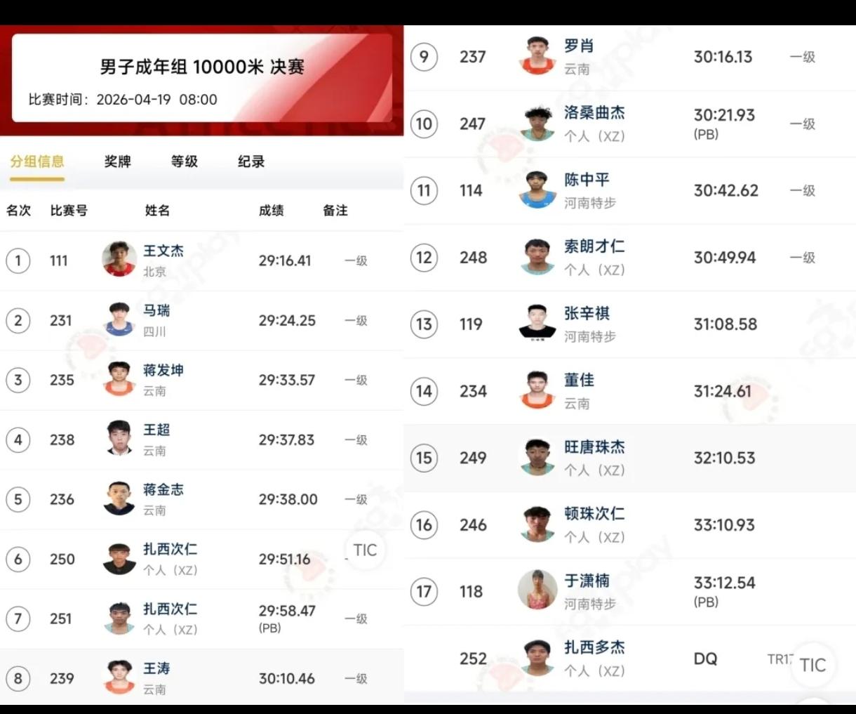29分16秒41!王文杰赛季万米首秀强势夺冠! 2026全国田径中长跑项群赛郑州站,王文杰后程领跑冲线,拿下男子万米冠军,这一成绩位列他个人生涯第四好。 马瑞、蒋发坤分获二三名,全场共7人跑进30分钟大关。 女子方面,次仁措姆摘金,夏雨雨斩获亚军。国内中长跑赛场,好状态持续在线! 王文杰 万米决赛 中长跑 田径比赛