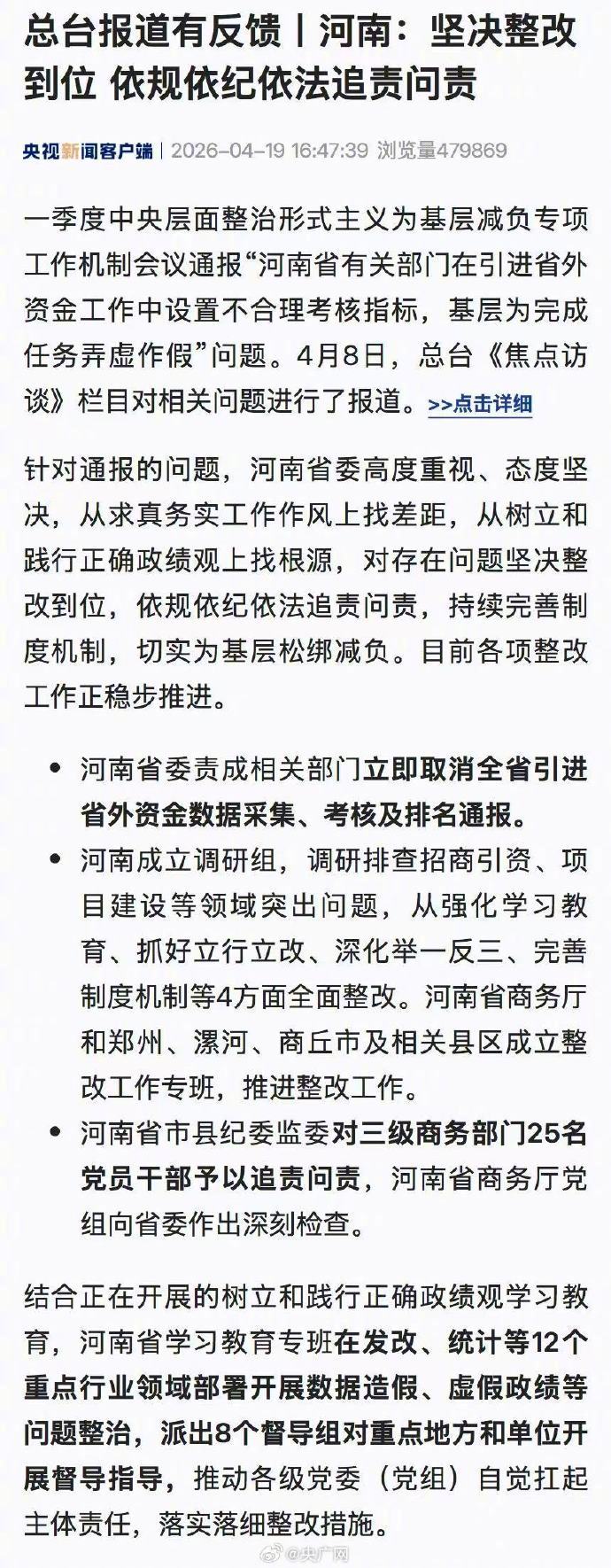 【#河南省委回应河南三地数据造假#】#河南三地数据造假后续来了#一季度中央层面整治形式主义为基层减负专项工作机制会议通报“河南省有关部门在引进省外资金工作中设置不合理考核指标,基层为完成任务弄虚作假”问题。4月8日,总台《焦点访谈》栏目对相关问题进行了报道。