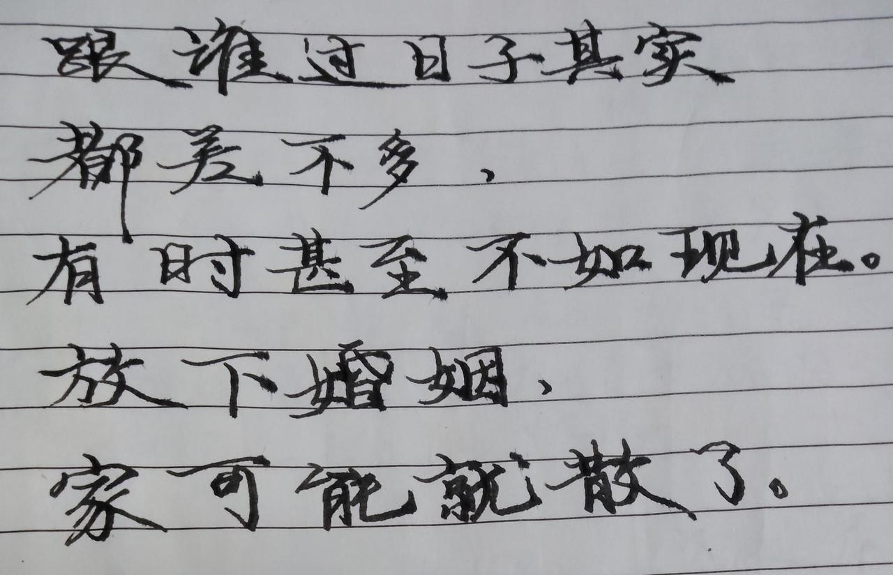 有情感专家说:“跟谁过日子其实都差不多,有时甚至不如现在。 放下婚姻,家可能就散了。” 这确实是句大实话,人无完人,谁都有缺点,“情人眼里西施”,恋爱时,智商为零,看不到对方的缺点,加上恋爱时善于隐藏自己的缺点,但两人相处久了,新鲜感一过,脱掉伪装,缺点显现,智商恢复,若没有一颗疼爱与包容的心,就会互相嫌弃。 所以并不是伴侣不够好,而是自己的心态变了,缺少了对伴侣的疼爱、理解、包容和信任。 我有位朋友俊娶了一位高大健壮又能干的妻子,家里家外的事情都不用他操心,就算工作时出差一年半载,他都不用担心,但是他觉得妻子没文化,只知道做工,不懂风情 。 他心心念念的白月光总是出现在他的脑海中,一次同学聚会恰巧遇到了他的白月光,两人就互留了电话,想再续前缘。 父母苦口婆心道:“你别身在福中不知福,找了这么一位能干的妻子,还不懂得珍惜,你以为你把白月光娶回来,就真的有那么好了吗?结婚后,你就会发现,其实跟谁过日子都是差不多的。” 可他就是不听劝,非要跟他的白月光在一起,在一起后才知道他的白月光只知道撒娇,家务活都不会做,下班回来还要侍奉他的白月光,白月光对家里的老人也不孝顺,甚至经常责骂老人,弄得家里鸡犬不宁 。 他现在后悔极了。 【原创】 今天摘抄《情感经典语录》。