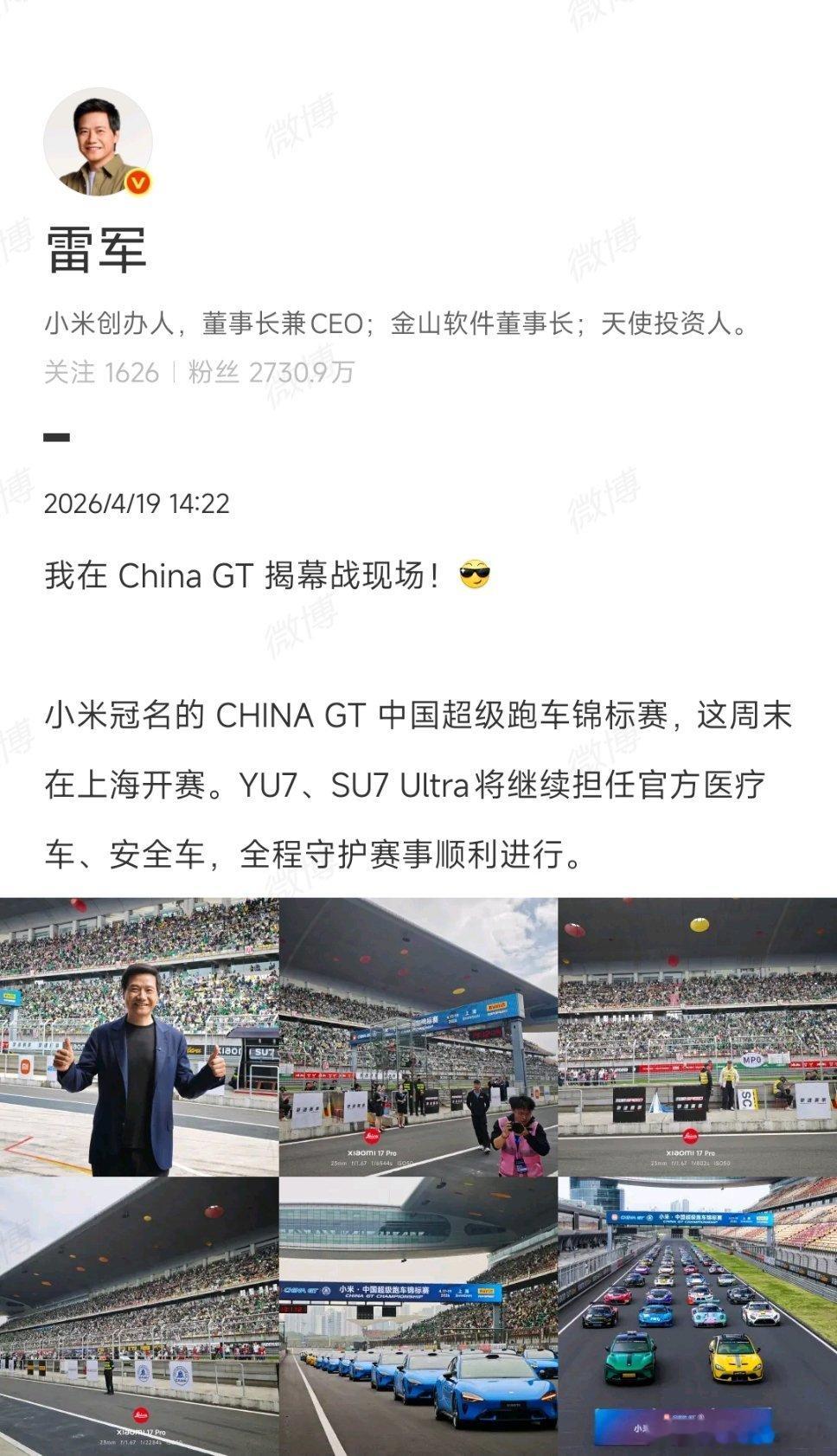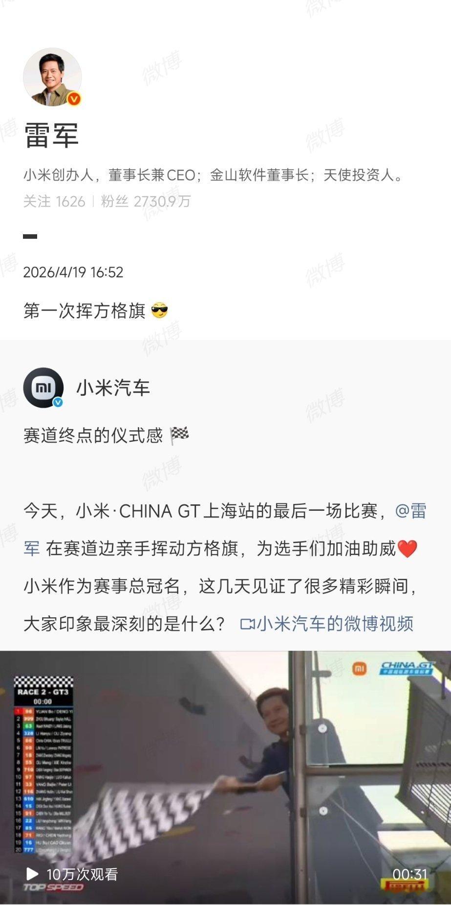 今天,雷军又亲临上海的ChinaGT,参加开场的车队巡游、亲自挥动方格旗,为中国赛车文化传播加了大分