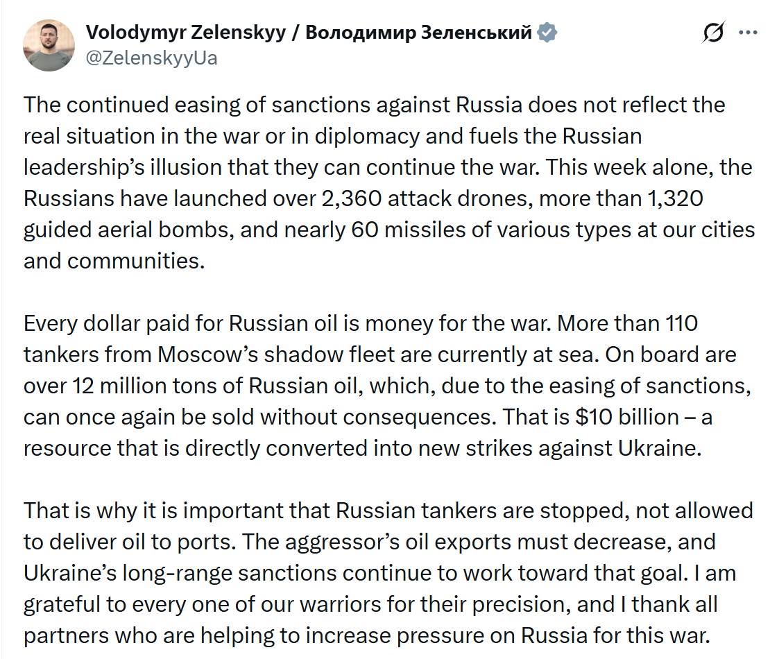 【#美方暂时放松对俄石油制裁#,泽连斯基急了】当地时间19日,乌克兰总统泽连斯基在X平台发文猛烈抨击美方关于暂时放松对俄石油制裁的措施。
