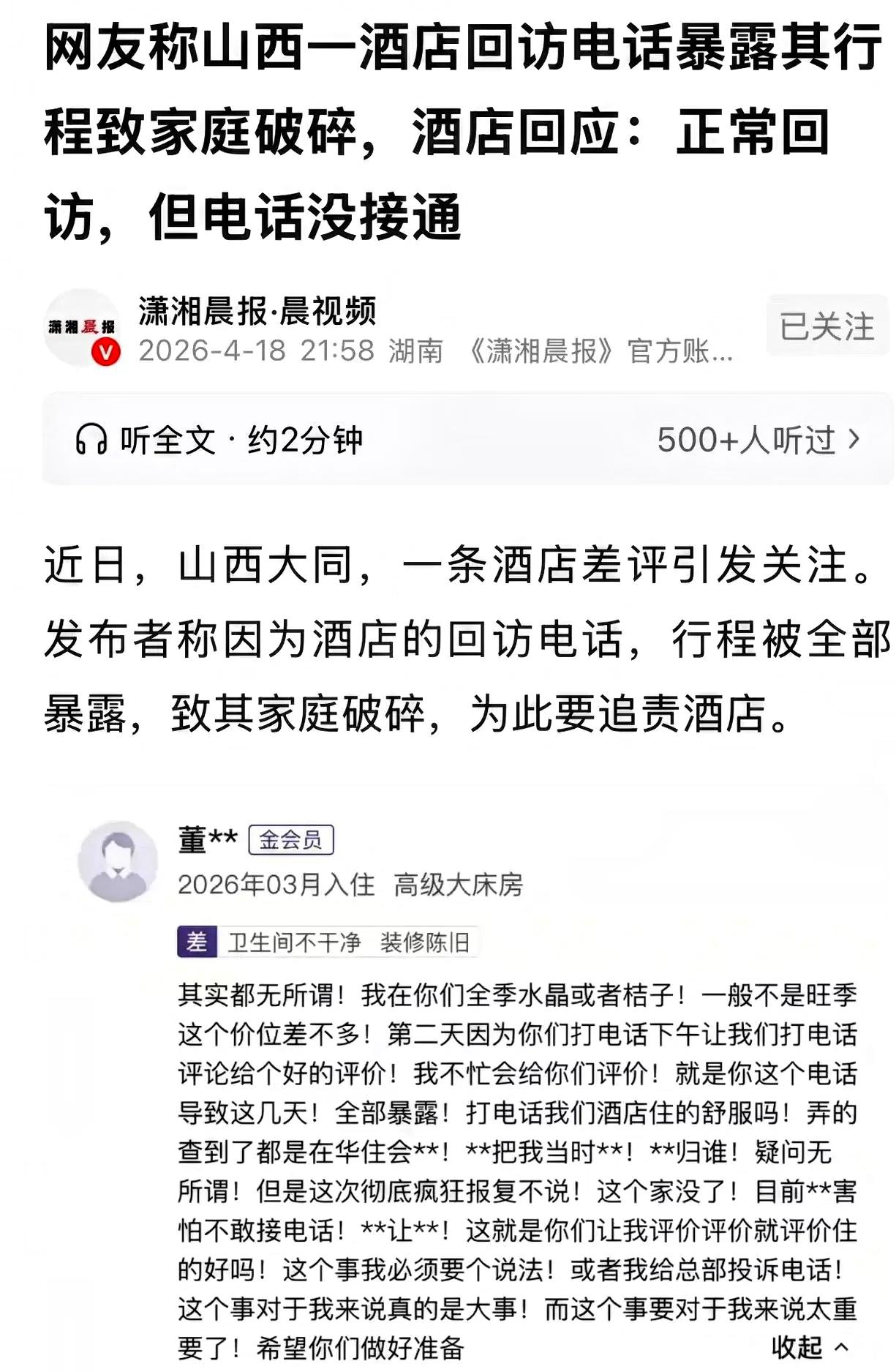 山西大同一董女士,哄骗老公说,自己因工作要出差几天,实则和情人去酒店开了几天房,她本以为此事不会被发现,生活还能如常继续。 退房之后,酒店按照常规流程进行回访,本意是征询入住体验,却意外让事情露出破绽。丈夫察觉异常后核实情况,才得知自己长期被隐瞒,内心深受伤害。面对无法挽回的信任裂痕,他最终选择结束婚姻,也不愿再让孩子跟随这样的母亲生活。而董女士试图联系的相关人员,也选择避而不见,不再回应。 令人意外的是,董女士并未反思自身行为,反而将家庭破裂的原因归咎于酒店的正常回访,不仅给出差评,还要求酒店给出解释。酒店方面也表示很无奈,正常的客户回访只是工作流程,并非有意窥探或破坏他人生活,这一责任实在无法承担。 婚姻的核心是真诚与忠诚,这是维系家庭最基本的准则。选择背叛,本身就已经打破了相处的底线,即便没有这次回访,隐瞒的事情也很可能在日后暴露。出现问题后,不反省自身,反而将过错推给无关的第三方,这样的态度并不能改变既成的事实。 一个家庭的离散,根源从来不在外界的偶然因素,而在于内部是否坚守责任与底线。成年人要为自己的选择负责,做错了事就要承担相应的结果,一味推卸责任,只会让事情变得更糟。 安稳的生活来之不易,守住初心和底线,才是对自己和家人负责。对于这件事,你觉得责任究竟在谁呢?