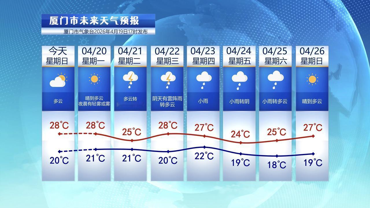 【4月20日至26日,厦门未来七天天气预报】 受弱冷空气影响,今天厦门气温不算高,但是体感温度还是挺不错的,今天光照也不错。 今天东渡本站最高温27.6℃,最低温20.1℃。 未来几天,厦门冷暖空气活动频繁,交换也比较频繁,这使得气温起伏较大。20日冷空气影响结束,气温回升,21日又新的冷空气到访,气温又下降,22-23日有暖湿气流,24日又有新的弱冷空气影响。 总的来说,冷暖空气不断交替、交汇,这使得天气不稳定,21-25日间,会有雨水,不过雨量不大,大家出门多关注天气变化。厦门旅游天气