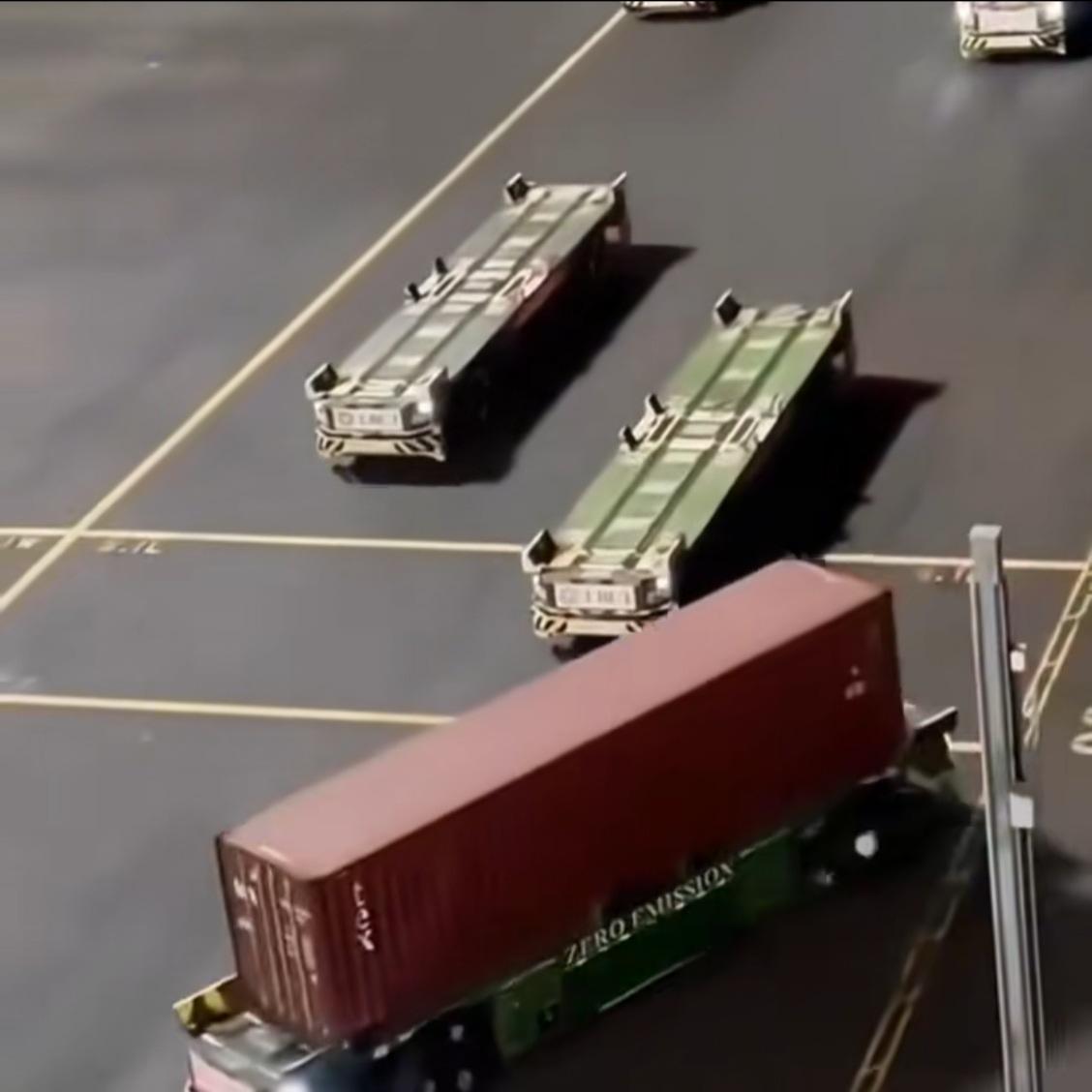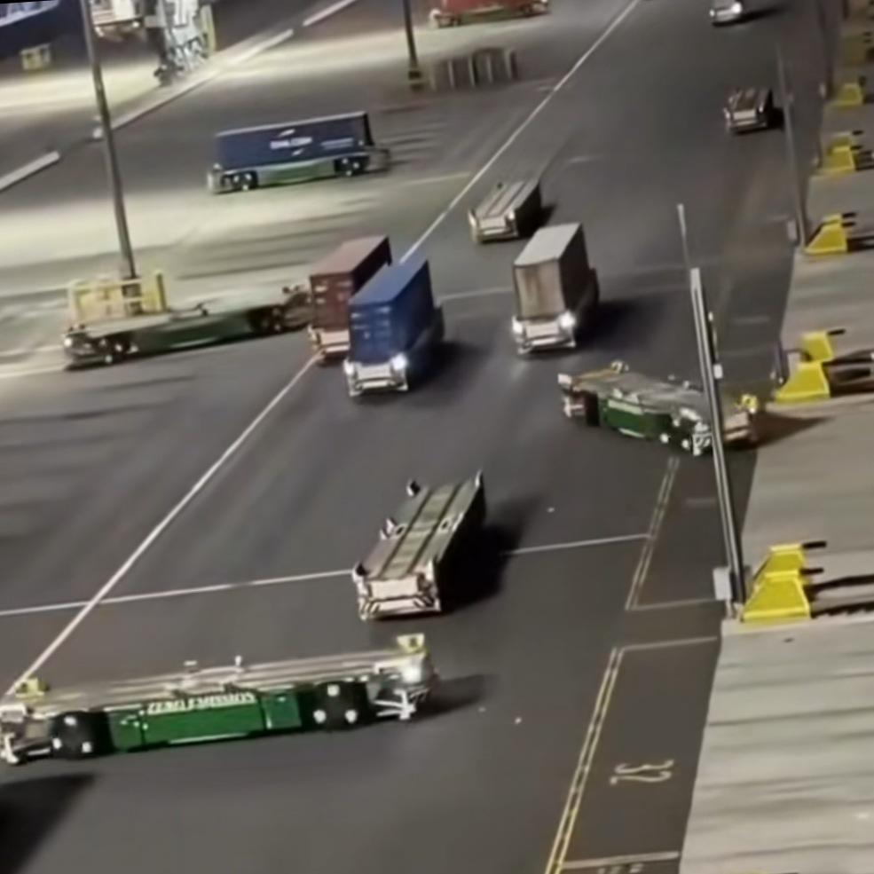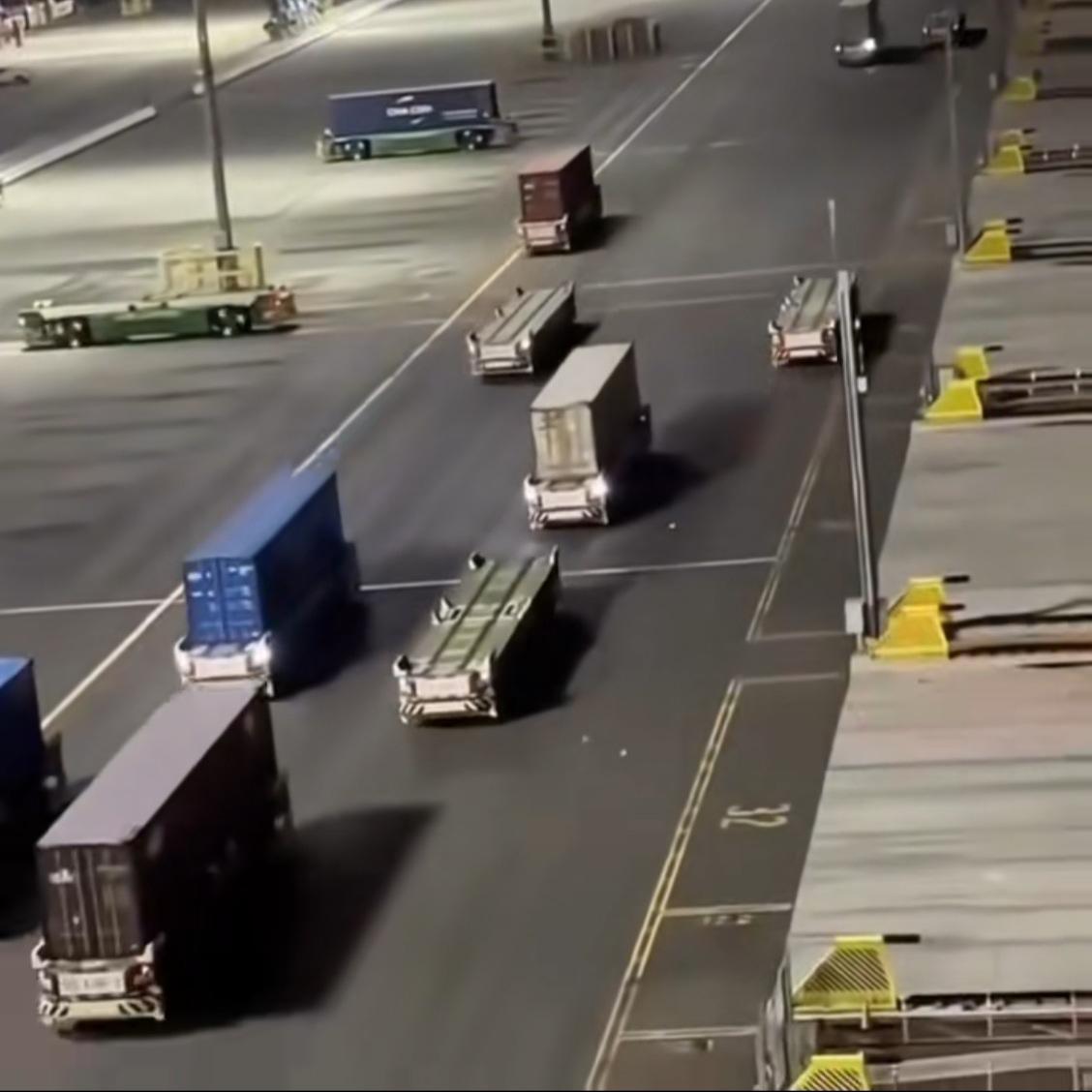 这是一个深夜的码头,你能看出它的特别之处吗? 是的,没有人!即使深夜,这些运送集装箱和杂货的车辆依然在忙碌,不眠不休。 车辆没有驾驶室,没有司机,一切都是智能运转,所有车辆各干各的,互不干扰。即使眼看要扎堆了,也能完美避让,各行其道。 一个偌大的码头,从装卸到运输,再到把货物安置到位,全部无人化操作,效率比人工还高。 只是,人呢?
