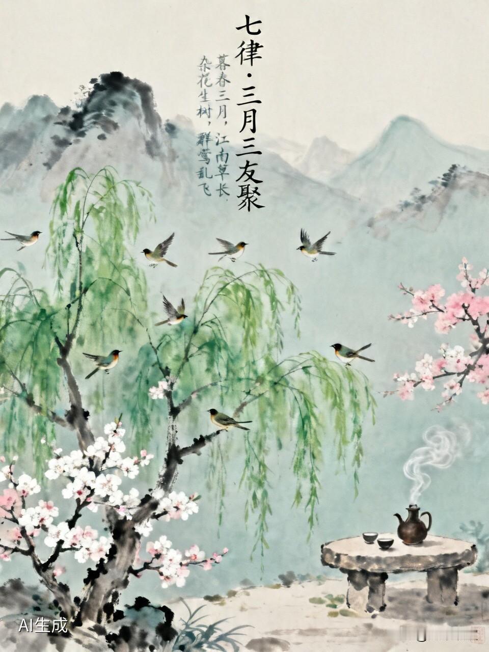 七律·三月三友聚 暮春三月,江南草长,杂花生树,群莺乱飞。值此上巳节良辰,与三五知己相聚江城,围炉煮酒,把盏言欢。酒入豪肠,诗由心生,遂成此律。愿与诸君共赏这份春日雅兴,也祝天下知己,岁岁常相见。 三月韶光暖入卮, 良朋邂逅意相期。 临窗细说当年事, 把盏同吟感慨诗。 高论抒怀追逸趣, 醇醪酌酒醉芳池。 莫辞此际欢娱短, 友谊绵长胜碧漪。 这首七律以“三月三”为题,起承转合皆有章法,读来音韵铿锵,意境高远。 首联:三月韶光暖入卮,良朋邂逅意相期。 开篇点题,既扣住了“三月三”的时令,又引入了聚会的雅兴。“韶光”喻春光,“暖入卮”将春光与酒香融为一体,画面感极强。次句直抒胸臆,“邂逅”二字尽显重逢之喜,“意相期”则点明了知己间心意相通的默契,奠定全诗欢快、真诚的基调。 颔联:临窗细说当年事,把盏同吟感慨诗。 承上启下,聚焦聚会核心场景。“细说当年事”是人间烟火,是共同的记忆回溯;“同吟感慨诗”是文人雅趣,是当下的情感抒发。一静一动,一俗一雅,将老友间那种无需多言、默契十足的亲密感描绘得淋漓尽致。 颈联:高论抒怀追逸趣,醇醪酌酒醉芳池。 此联是全诗的高潮,气势开阔。“高论抒怀”写言谈之乐,古今中外,快意恩仇;“追逸趣”点出对自由生活的向往。下句转入酒酣之态,“醇醪”指美酒,“醉芳池”则描绘出微醺后沉醉于春日美景的惬意,动静相宜,豪情与雅致并存。 尾联:莫辞此际欢娱短,友谊绵长胜碧漪。 以哲理收束,升华主题。“莫辞”二字劝人珍惜当下,“欢娱短”道出时光易逝的感慨。最后一句,以水喻情,“友谊绵长胜碧漪”将无形的情谊化为有形的春水,既呼应了春日主题,又表达了友谊地久天长的美好祝愿,余韵悠长。 全篇总结: 全诗紧扣“三月三友聚”,平仄工整,一韵到底(四支),无拗救之嫌。从春光入酒,到老友重逢;从谈古论今,到把酒言欢;再到情谊绵长,层层递进,既描绘了生动的聚会场景,又抒发了真挚的情感,是一首情景交融、声情并茂的佳作。 原创诗词 原创诗歌 三月三