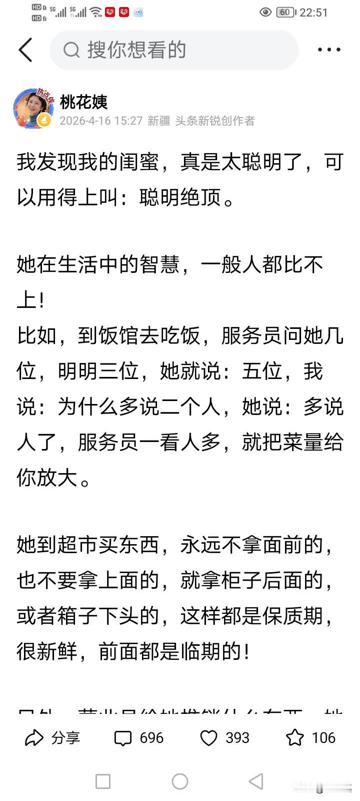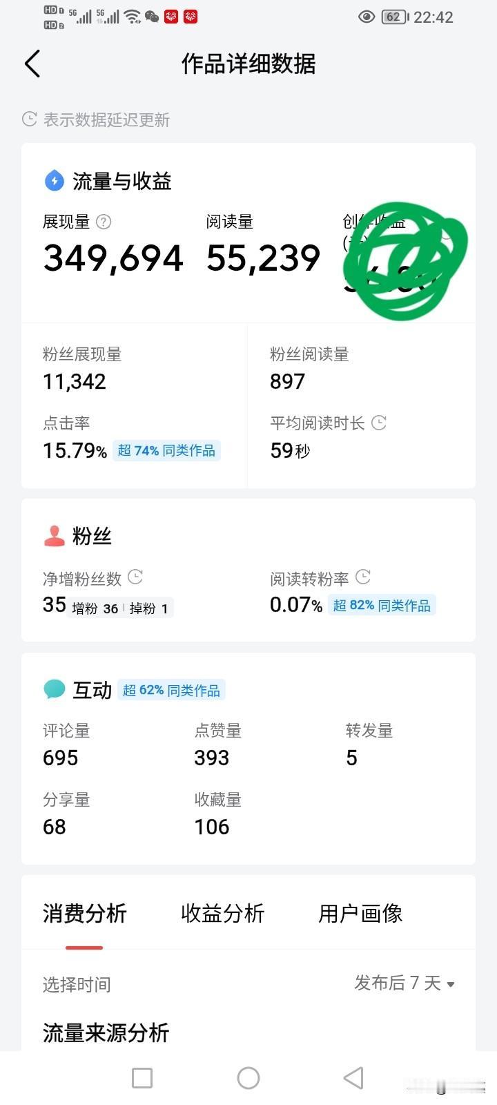 好消息传来,几天前,在今日头条上写了一个微头条! 出了一个大爆款,主要内容概括起来:就是写我闺蜜在生活中的小聪明大智慧! 结果这篇微头条就成了一个爆款! 具体数据如下: 展现量34万, 阅读量5.5万多, 近700多条评论, 我90%的评论都进行了回复! 作品的点赞,近400 收藏数,106。 而且这些数据还正继续在增多! 还有好多粉丝转发的。 收益我也很理想! 因为这些内容都是来自生活的,是生活的具体表现,和大家一日三餐,平时购物息息相关,也是贴近生活! 所以受到了大家的喜欢,在这里真的要感谢我的粉丝,感谢我遇到了优秀的平台,我后面还会加倍继续努力,创作出更好的作品!