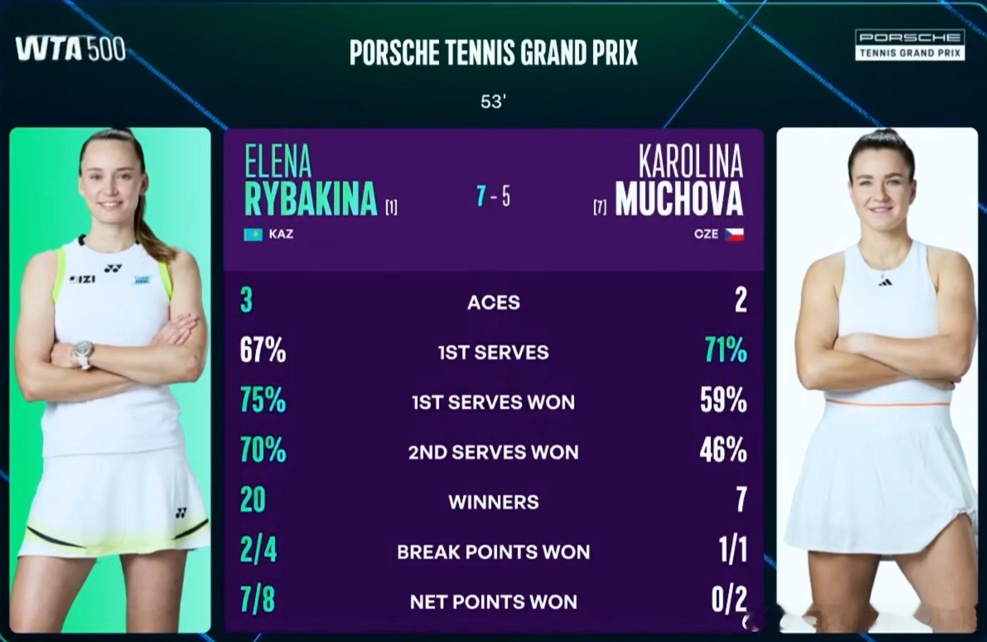 即时战况:斯图加特站决赛,莱巴金娜第1盘被追到5-5平,凭借盘末的关键破发以7-5拿下首盘大比分1-0领先穆霍娃! 莱巴金娜决赛第1盘发球和进攻发挥及其出色,1发和2发得分率都超过70%,并拿下20个制胜分!