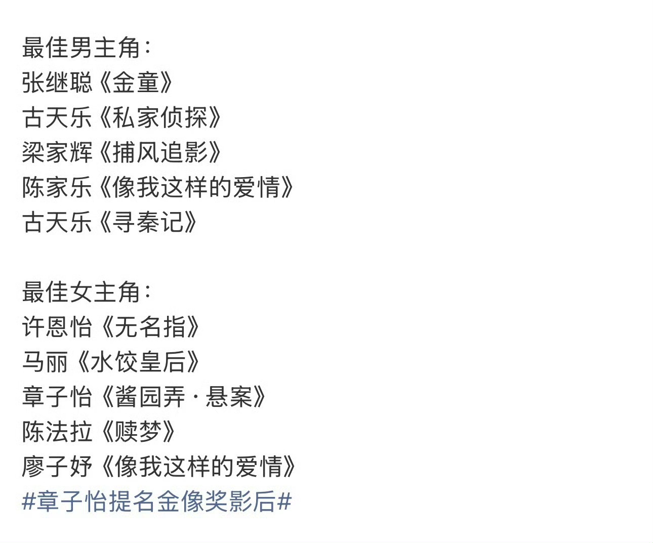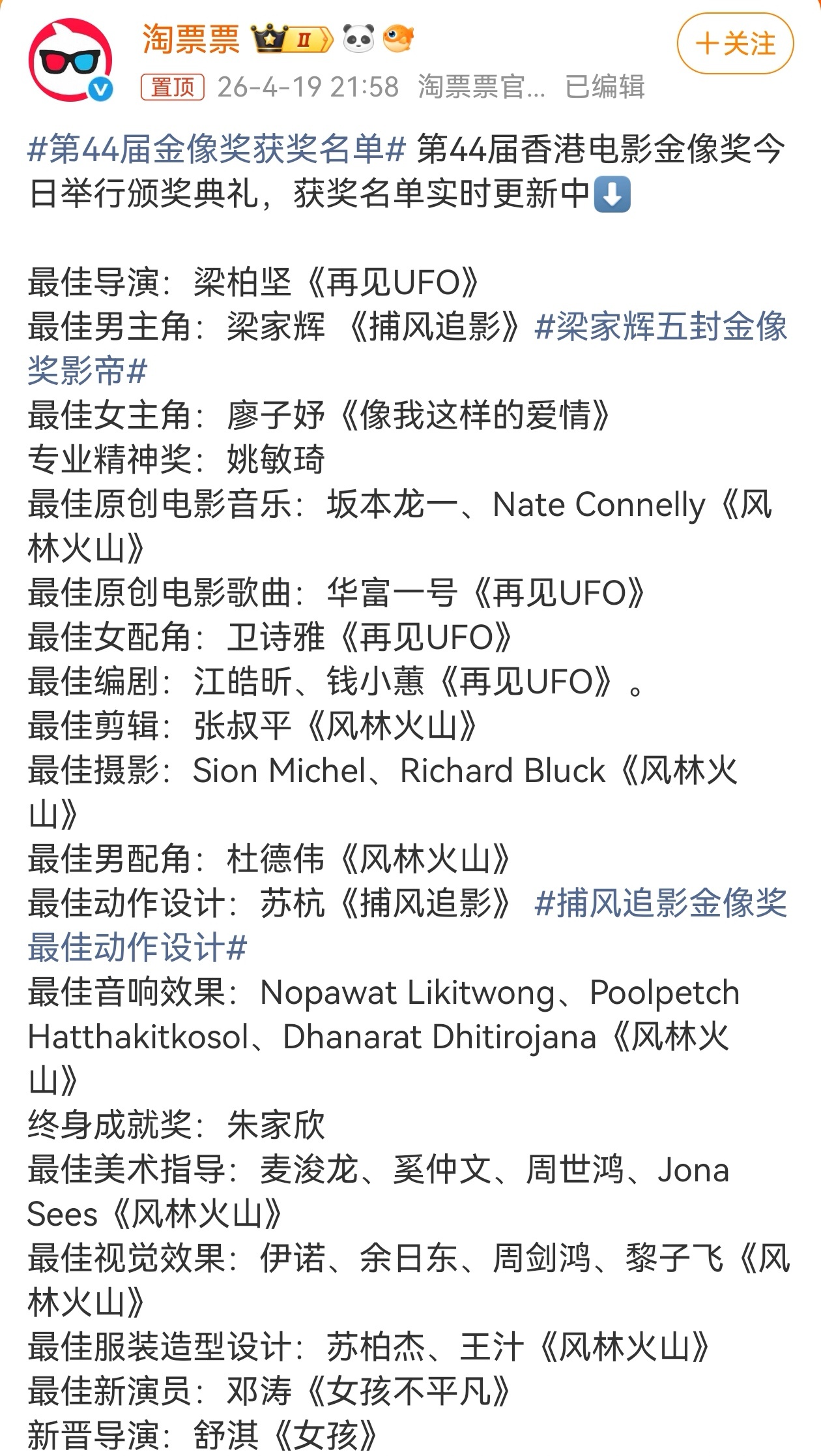 恭喜金像奖影帝梁家辉,梁家辉以《捕风追影》中冷峻深沉的警探角色,第五度加冕金像奖最佳男主角,横跨数十年依旧保持巅峰状态。恭喜金像奖影后廖子妤,在《像我这样的爱情》里,廖子妤为饰演脑性麻痹患者“阿妹”,深入体验生活、精准还原肢体与情感,首次提名便击败章子怡、马丽等强敌,成为首位马来西亚籍金像影后。第44届金像奖获奖名单