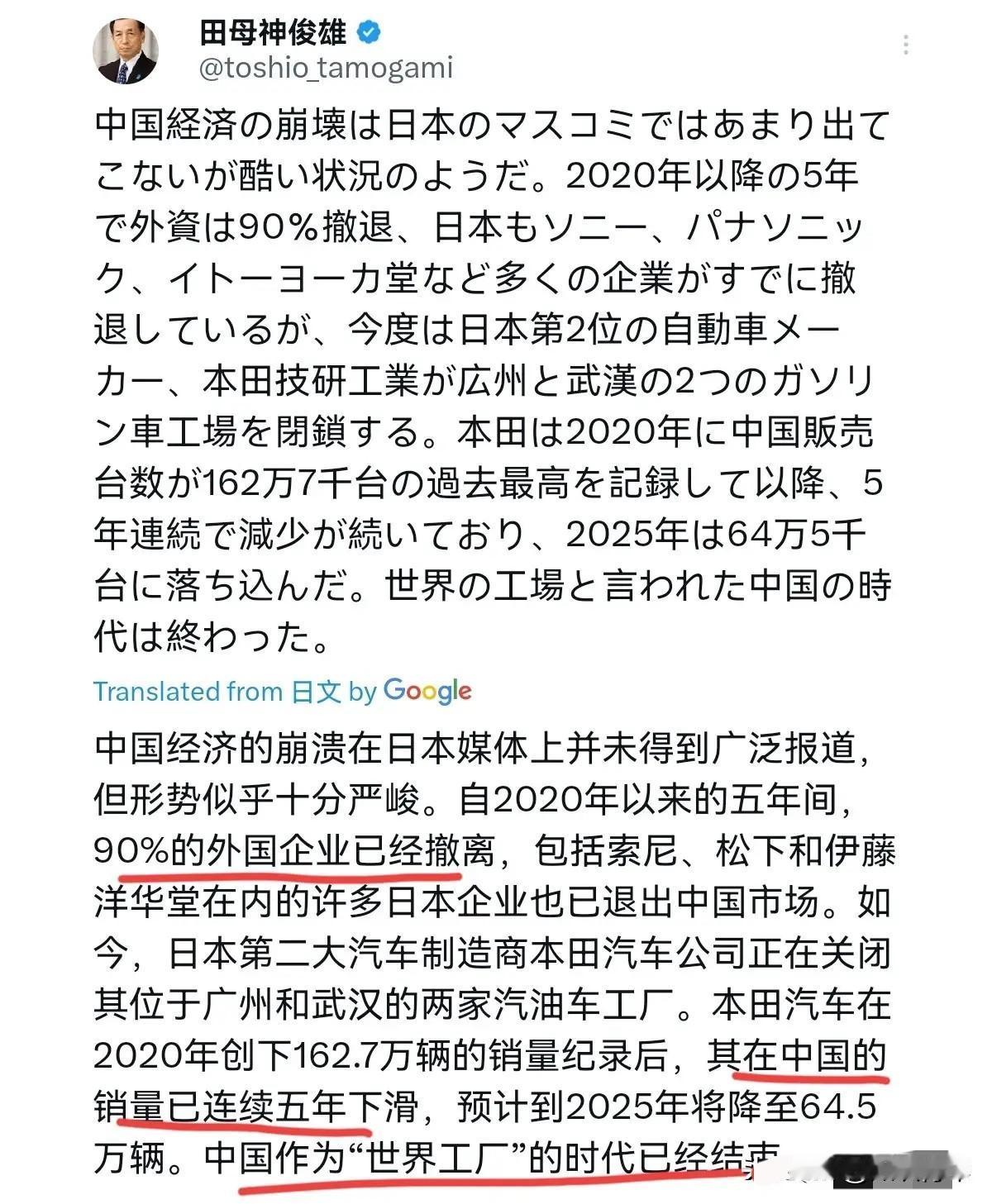 日本前航空幕僚长田母神俊雄声称,中国时代已然终结!4月19日,田母神俊雄表示,虽然日本媒体很少报道“中国经济崩溃”,但情况似乎十分严峻。2020年之后的五年间外资“已撤离”90%,日本方面索尼、松下、伊藤洋华堂等众多企业也已“撤出”。此番日本第二大车企本田技研工业,将关闭位于广州和武汉的两家燃油车工厂。 本田自2020年在华销量创下162.7万辆的历史新高后,销量已连续五年下滑,2025年跌至64.5万辆。曾被誉为“世界工厂”的中国时代已然终结。在中日关系交恶的背景下,此人竟然说出来如此罔顾事实,颠倒黑白的话这,这说明此人对于中国,对于日本的处境一无所知。 田母神俊雄这番言论听起来挺唬人,但稍微查查数据就知道漏洞百出。他说2020年后外资撤离了90%,可中国商务部最新数据显示,2025年全国新设立外商投资企业70392家,同比增长19.1%,实际使用外资金额7476.9亿元人民币。如果外资真跑了90%,哪来这么多新企业注册?更打脸的是,日本对华投资在2025年前三季度同比激增55.5%,成为对华投资增长最显著的国家之一。这跟“撤离”完全相反,日本资本正在加速进入中国。 至于索尼、松下这些日企,确实有些业务在调整,但那是结构性转型,不是全面撤退。松下在上海设立了新能源汽车子公司,加大对华投资;日立、电装等企业正在中国布局新能源、AI配套、高端材料项目。日企在华战略已经从过去的“加工制造”转向“研发+制造+供应链中枢”,这是产业升级,不是逃离。 本田销量下滑更是个典型案例,但原因根本不是中国经济崩溃。本田2025年销量跌到64.5万辆,主要问题出在自己身上:电动化转型太慢,纯电车型缺乏竞争力,核心零部件依赖进口,智能化跟不上中国消费者的需求。同一时期,丰田在中国市场销量还实现了微增,日产也只是小幅下滑。日系三强分化明显,本田的问题在于战略摇摆和本土化不足,这能怪中国经济? 中国经济2025年顶压前行,GDP增长5%,国内生产总值首次跃上140万亿元新台阶。汽车产业产销突破3400万辆,连续17年全球第一;新能源汽车产销连续11年全球第一。这些实实在在的数据,田母神俊雄是看不见还是不想看? 这位前航空幕僚长的言论,更像是为了迎合某些政治立场而刻意制造的恐慌。中日关系确实面临挑战,但经济合作的实际状况远比政治口号复杂。日本企业正在重新调整在华战略,从低端制造转向高技术领域,这种转型升级恰恰说明中国市场依然充满机遇。 把个别企业的经营困难夸大成整个国家的经济崩溃,这种论调既不负责任也不符合事实。中国作为“世界工厂”的时代没有终结,而是在向“世界创新工场”转型。外资没有大规模撤离,而是在重新布局;日企没有全面撤退,而是在优化投资结构。 各位读者你们怎么看?欢迎在评论区讨论。