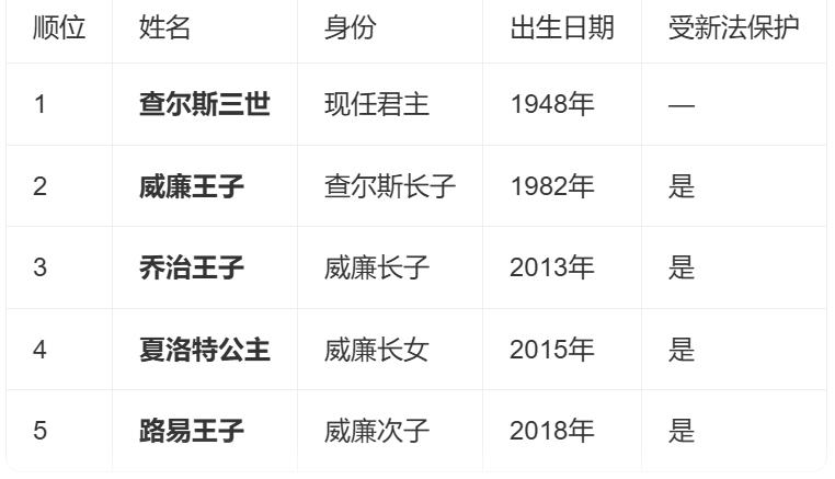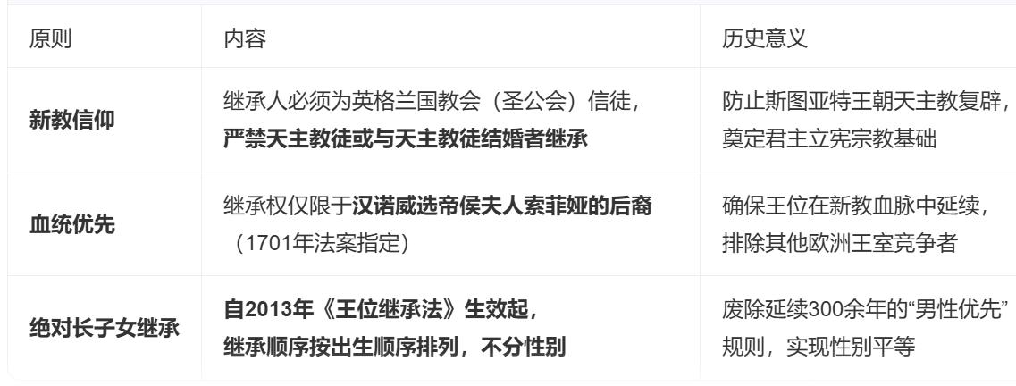 英国王位继承制度 ✅看似混乱的“几世”命名,实则遵循一套严谨、透明且历经法律演化的规则体系。其核心逻辑可归纳为三大支柱:同名排序、宗教门槛、法律优先。 “几世”编号:同名君主的流水账,非王朝更替 英国君主的“几世”编号,仅依据其个人名字在历史上出现的次数,与王朝名称、血缘分支或统治时期无关。 乔治三世 = 英国历史上第三位名叫“乔治”的国王(前两位:乔治一世、乔治二世) 伊丽莎白二世 = 英国历史上第二位名叫“伊丽莎白”的女王(首位:伊丽莎白一世) 查尔斯三世 = 英国历史上第三位名叫“查尔斯”(Charles)的国王(前两位:查理一世、查理二世) 关键澄清: “查理”与“查尔斯”是同一名字的英式与美式拼写差异,不视为不同名字。 历史上存在“长者爱德华”“殉教者爱德华”等非正式编号的早期君主,但现代编号仅从1066年诺曼征服后开始系统统计,此前的同名君主不计入“几世”序列。 这种命名法源于欧洲传统,目的是在同名君主间建立清晰的代际区分,而非反映家族谱系。因此,汉诺威王朝的乔治三世与温莎王朝的乔治六世,虽相隔两百年、不同王朝,但因同名,仍连续编号。 ✅继承铁律:新教血统 + 绝对长子女继承 自1701年《王位继承法》确立以来,英国王位继承遵循不可动摇的三大法律原则:(见表) 重要例外: 2013年改革仅适用于2011年10月28日之后出生的王室成员。 安妮公主(1950年出生)仍受旧法约束,继承顺序落后于弟弟安德鲁王子(1960年出生) 夏洛特公主(2015年出生)则优先于弟弟路易王子(2018年出生),成为王位第三顺位继承人 ✅唯一退位:爱德华八世的宪政危机。 英国历史上仅有一次君主主动退位,彻底改写继承路径: 1936年,爱德华八世为迎娶离异美国女性沃利斯·辛普森,拒绝放弃婚姻,引发宪政危机。 在政府、教会与民众的集体反对下,他选择退位,成为温莎王朝唯一退位君主。 继承权自动顺延至其弟:约克公爵阿尔伯特,即乔治六世(伊丽莎白二世之父)。 退位者仍保留在继承序列中,但因无子嗣,其后裔无权继承。 此事件证明:王位继承由法律决定,非君主个人意志。议会可否决君主婚姻,亦可接受其退位,体现“王在议会”的宪政本质。 当前继承顺序(2026年) 依据2013年改革后的绝对长子女继承制,当前王位继承顺序前五位为:(见表)哈里王子(2011年出生)因早于2011年10月28日,仍受旧法约束,其继承顺序仍高于其子女,但低于夏洛特公主。