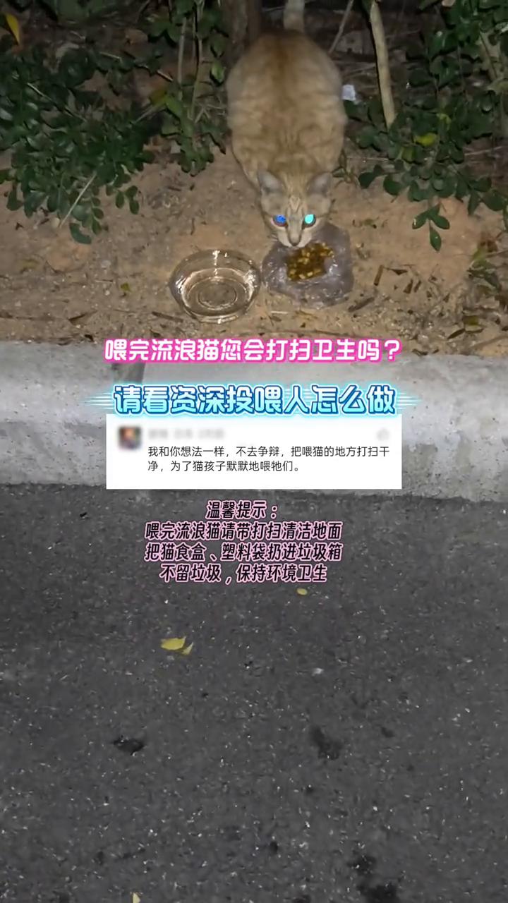喂完流浪猫您会打扫卫生吗?请看资深投喂人怎么做。 我和你想法一样,不去争辩,把喂猫的地方打扫干净,为了猫孩子默默地喂它们。 温馨提示:喂完流浪猫请带打扫清洁地面,把猫食盒、塑料袋扔进垃圾箱,不留垃圾,保持环境卫生。