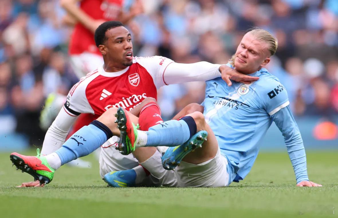 曼城2比1阿森纳 这场球加布里埃尔确实很郁闷。哈兰德那个进球,两个人彼此纠缠,加布里埃尔没挡住哈兰德。然后加布里埃尔就把哈兰德的球衣给撕碎了,不仅是外面的球衣,里面的保暖内衣都撕碎了,导致哈兰德直接换了一件球衣。然后就是两人顶牛,加布里埃尔有个发力的动作,主裁判安东尼-泰勒息事宁人,各给了一张黄牌。其实给红牌也是有理由的,加布里埃尔很幸运。英超争冠
