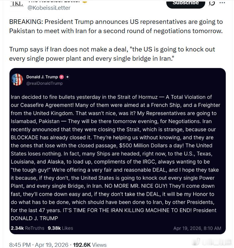 他表示,如果伊朗不达成协议,“美国将摧毁伊朗每一座发电厂和每一座桥梁。”