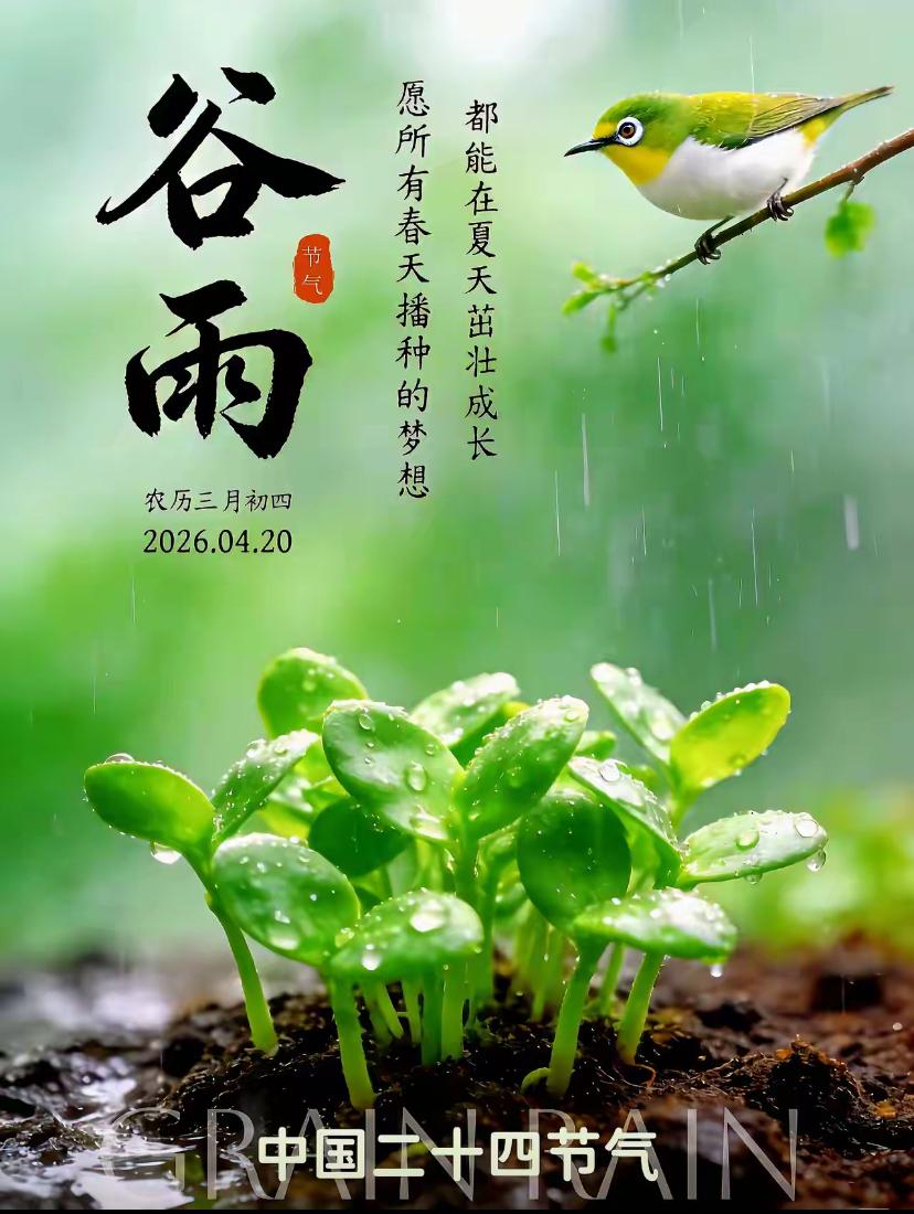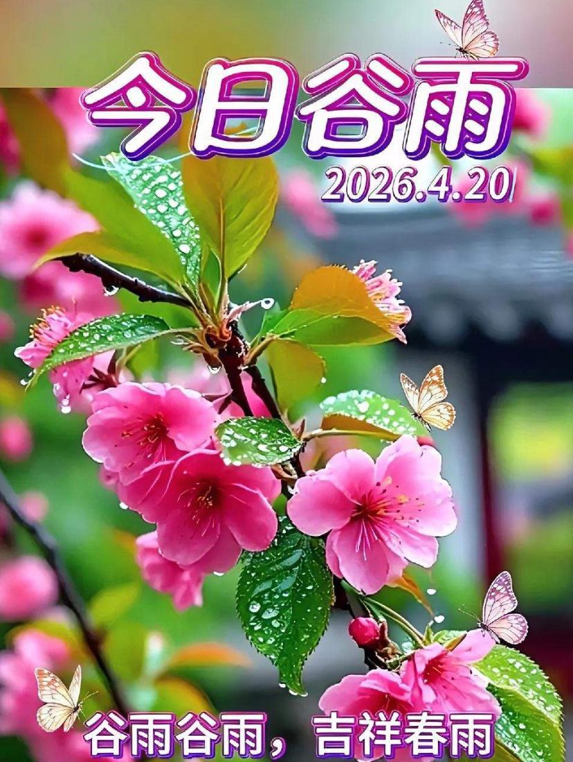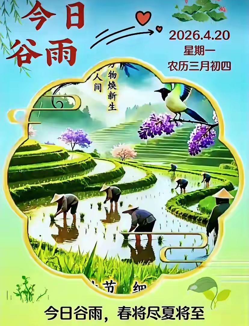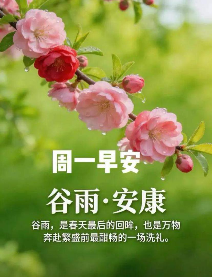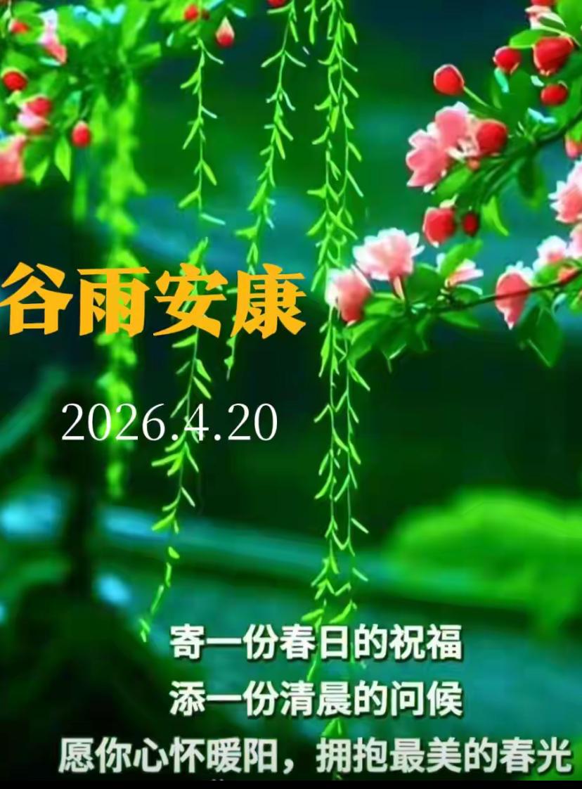 🌺☘️2026./4.20.周一春晨问安☘️🌺 🌾💦谷雨,谷雨,吉祥春雨。春烟绕林,雨生百谷,福满朝夕。春意正浓,细雨轻落,润了芳华,安了人心。愿暮春细雨带走忧愁,送来安康顺遂,愿你在温柔春光里,守一份心安,过平凡日子;携一份美好,让锦绣前程坦荡辽阔。周一清晨,旭日东升,映照四季顺遂,春暖花开送平安,牵挂如影随形伴,好运连连福满堂。 晒图笔记大赛 谷雨 四谷雨节气 谷雨遵生