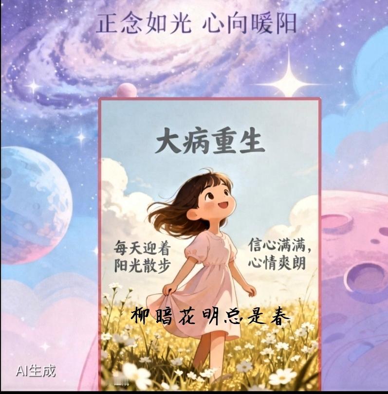 我心中的定海神针 【中晚期卵巢癌康复8年/经验】 牢固树立心中的正念,不让负能量占位。即使冒出坏念头,也转瞬即逝。 正念,就是生命的定海神针。 ✨✨ 人生就两件事: 第一,活着; 第二,明白。 ✨✨ 我明白: ★ 疾病的第一发动力,往往来自心中的负能量。长期纠结、焦虑,必定身虚体弱。 ✨✨ ★ 好好活着,靠的是心中坚挺不倒的正念。正念化生正气。 正气,才是一个人最好的保护神。 正气足,就像小太阳,心中的阴霾会自动化散。 ✨✨ 齐善鸿教授说: 人这辈子最大的能耐,就是别生大病; 最幸运的,是生了大病还能治; 最大的智慧,是因为生了病,突然明白了命。 ✨✨ 我的今日感悟 活着 好好活着 心灵的正念 正念法则