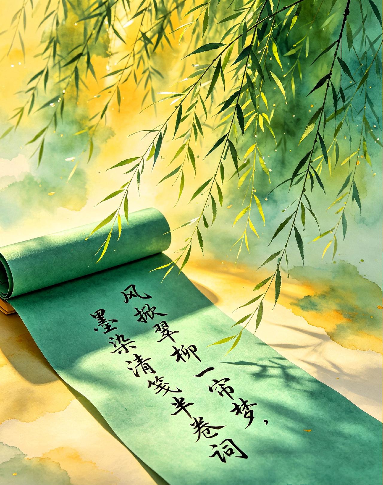 上联:风掀翠柳一帘梦, 下联:墨染清笺半卷词。 解析:上联以风拂翠柳起兴,绘出春日朦胧如梦境的清幽之景; 下联转笔写文人伏案,笔墨落于素笺,半卷清词尽抒心怀。 一景一情,一自然一笔墨,意境温婉相契,对仗工整。 文学创作大会