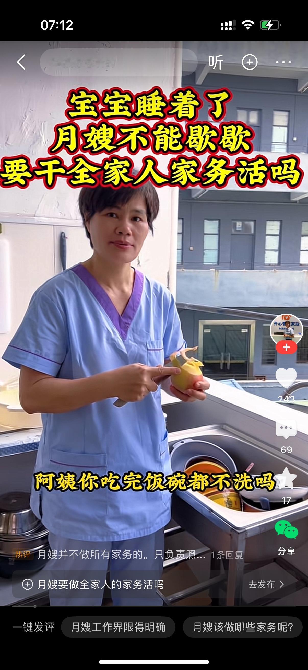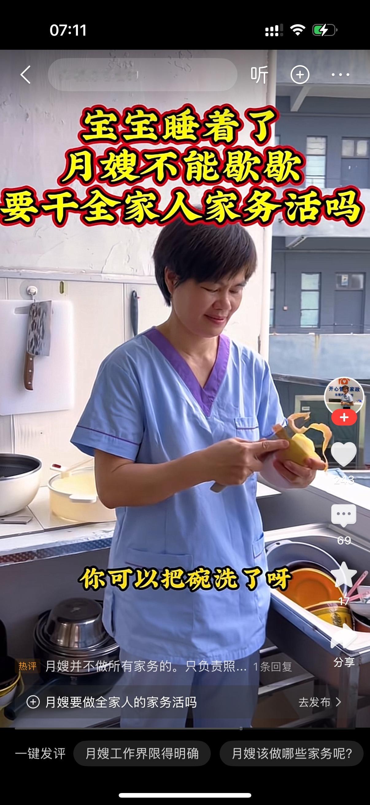 女主人看到保姆在削苹果,怒斥她,阿姨你吃完饭都不洗碗吗?难道还要我们来洗吗?保姆回答,我是过来照顾宝宝和宝妈的。女主人说,孩子现在睡觉,你可以把碗洗了呀。保姆回她,我不洗,这不是我的活。女主人彻底怒了,你下户吧,你这个好吃懒做的保姆。保姆嘟囔,周扒皮,我还不想干了。女主人脸都绿了。